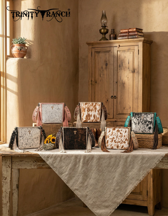 TR207-8360BK Trinity Ranch Cowhide Fringe Crossbody Bag - Black