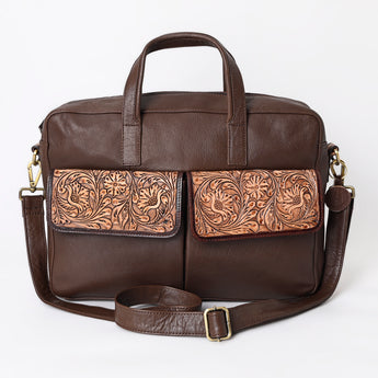 - Hand tooled floral leather on the flap pockets