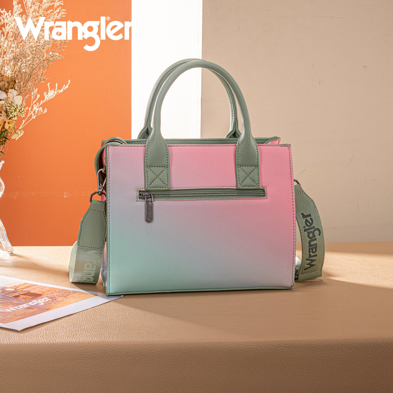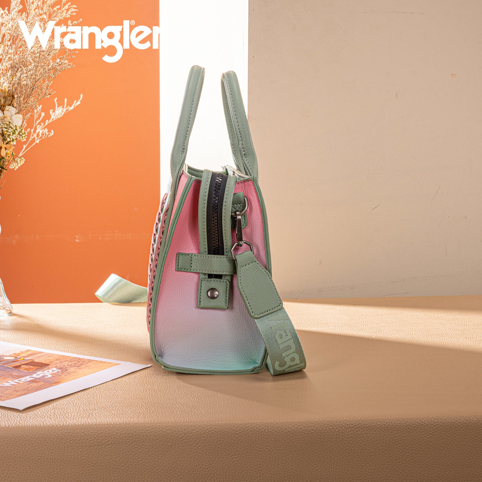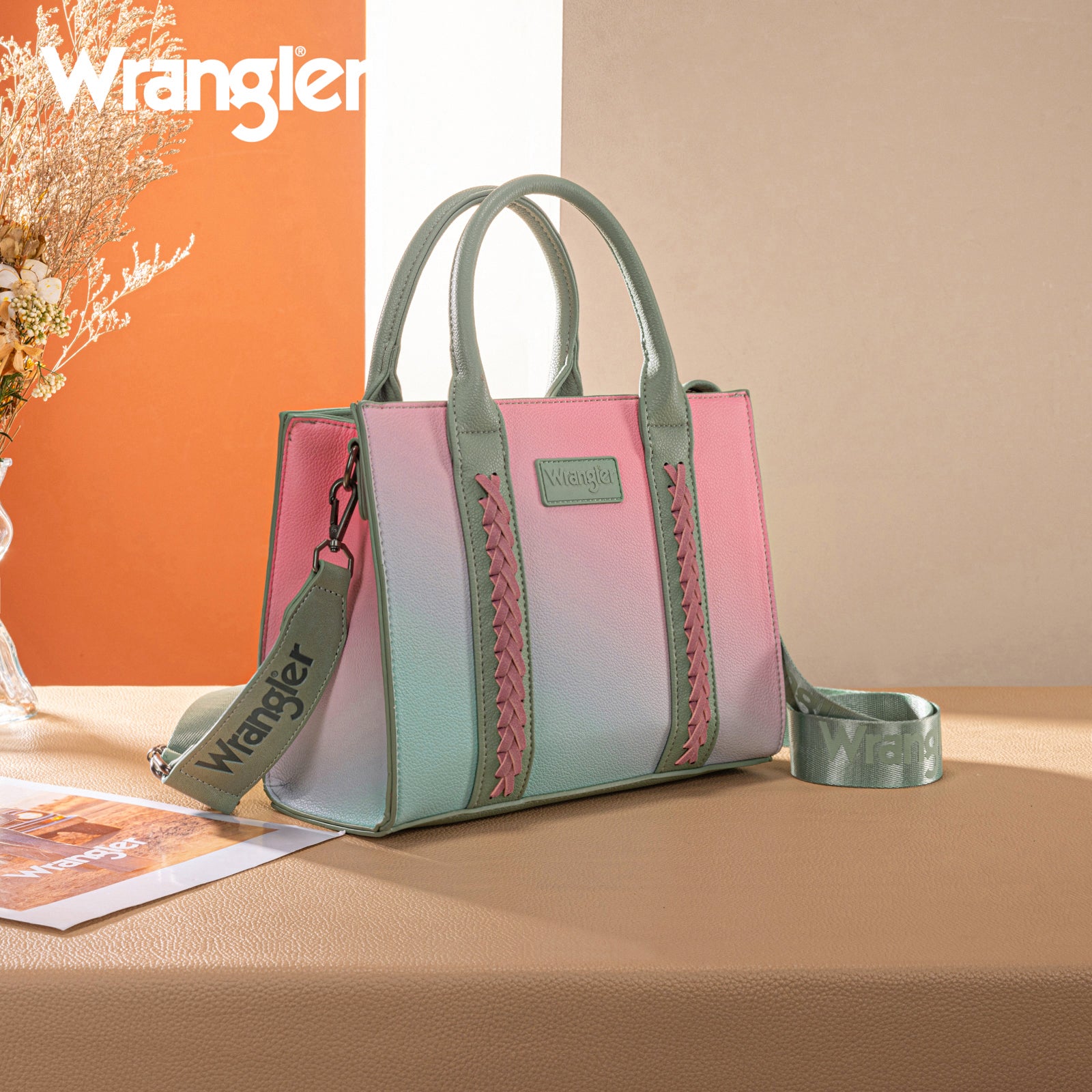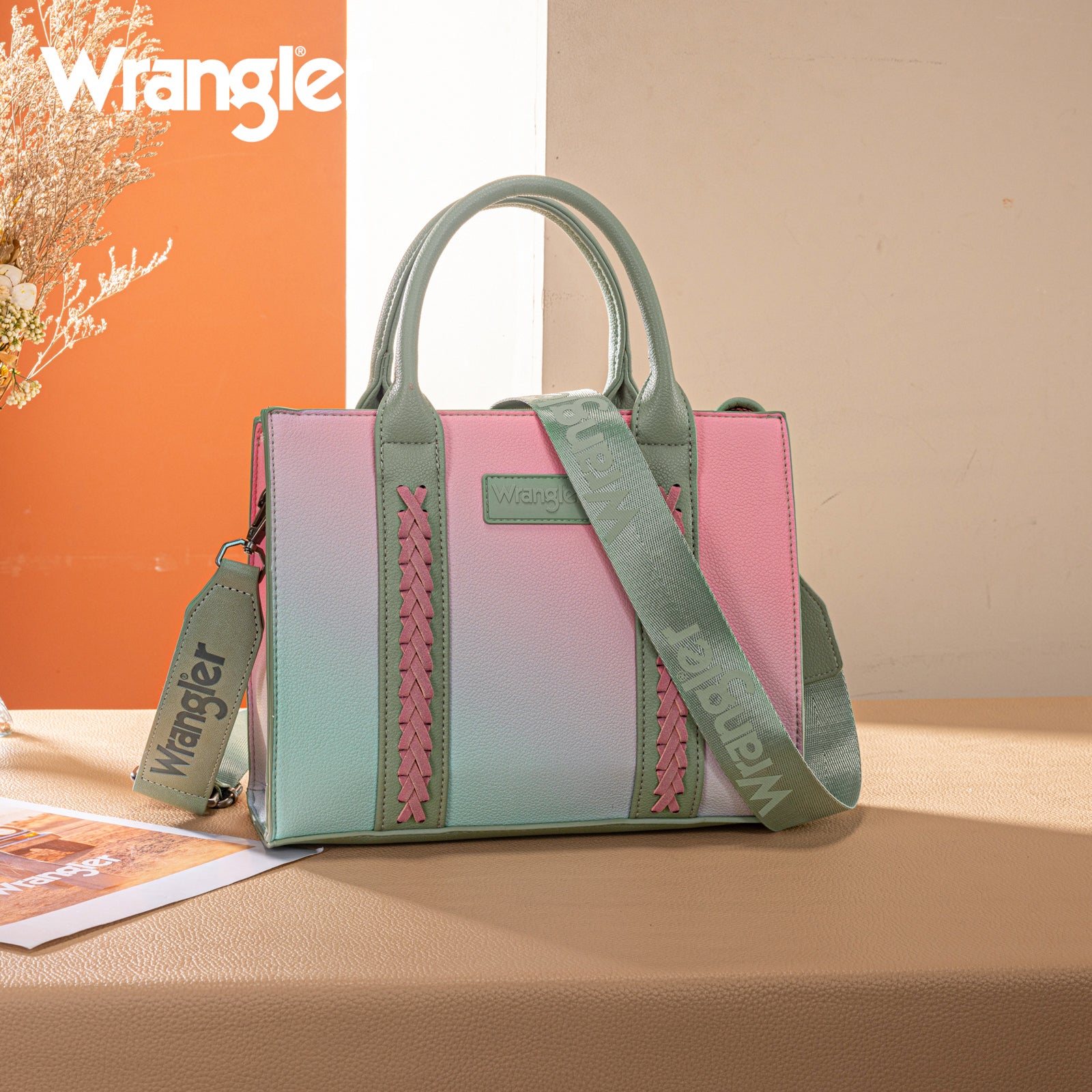 This structured satchel features a soft ombre finish with braided accents and the Wrangler logo for a bold yet feminine look.
