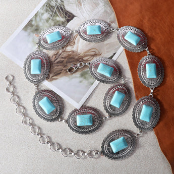 RCB-1036 Rustic Couture Etched Silver/Bronzw Oval Stone Centered Concho Link Chain Belt
