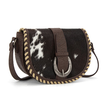 This saddle-style crossbody features genuine hair-on cowhide on the front, making each bag beautifully unique. Framed with whipstitch detailing and finished with an antique silver horseshoe buckle, it’s the perfect statement piece for everyday wear.
