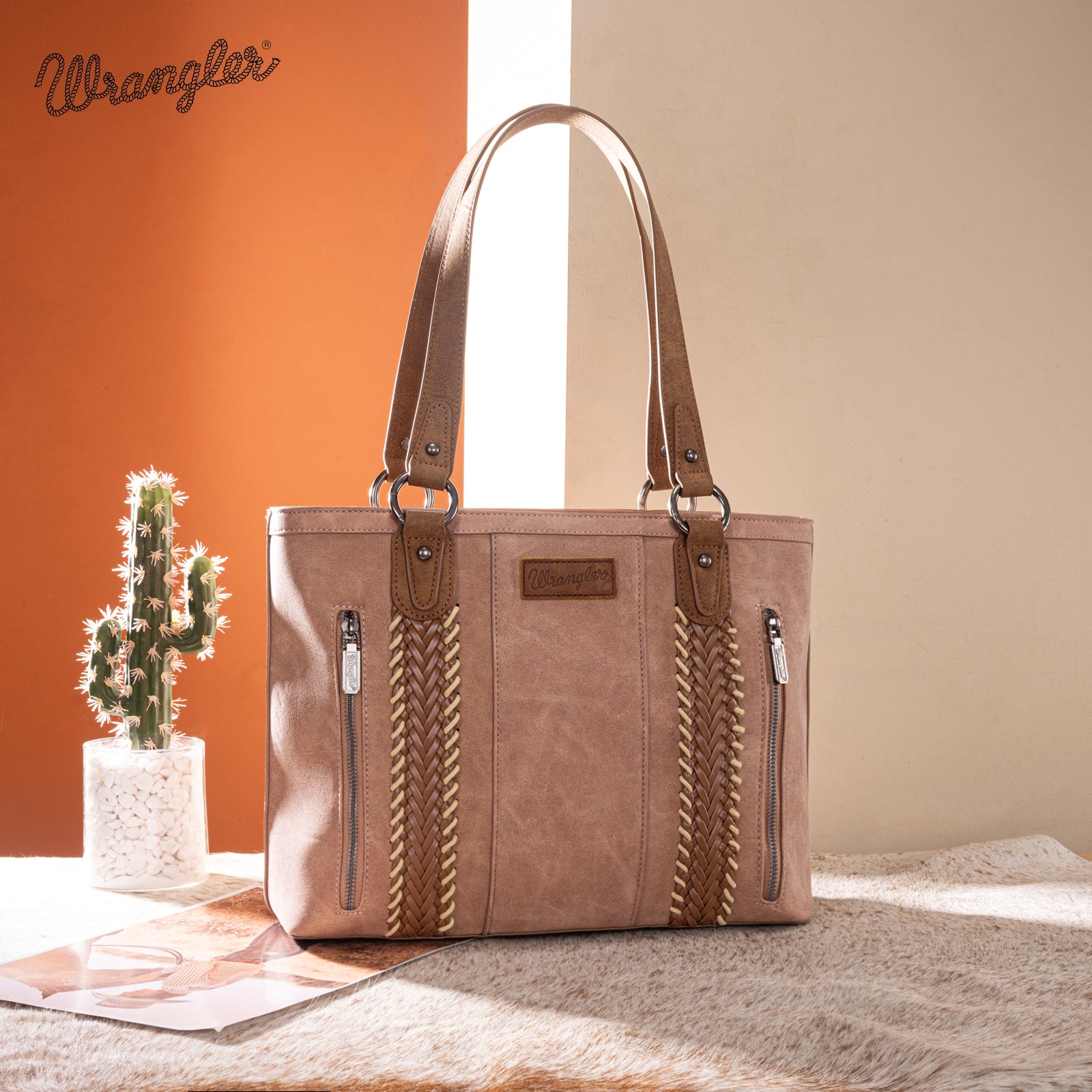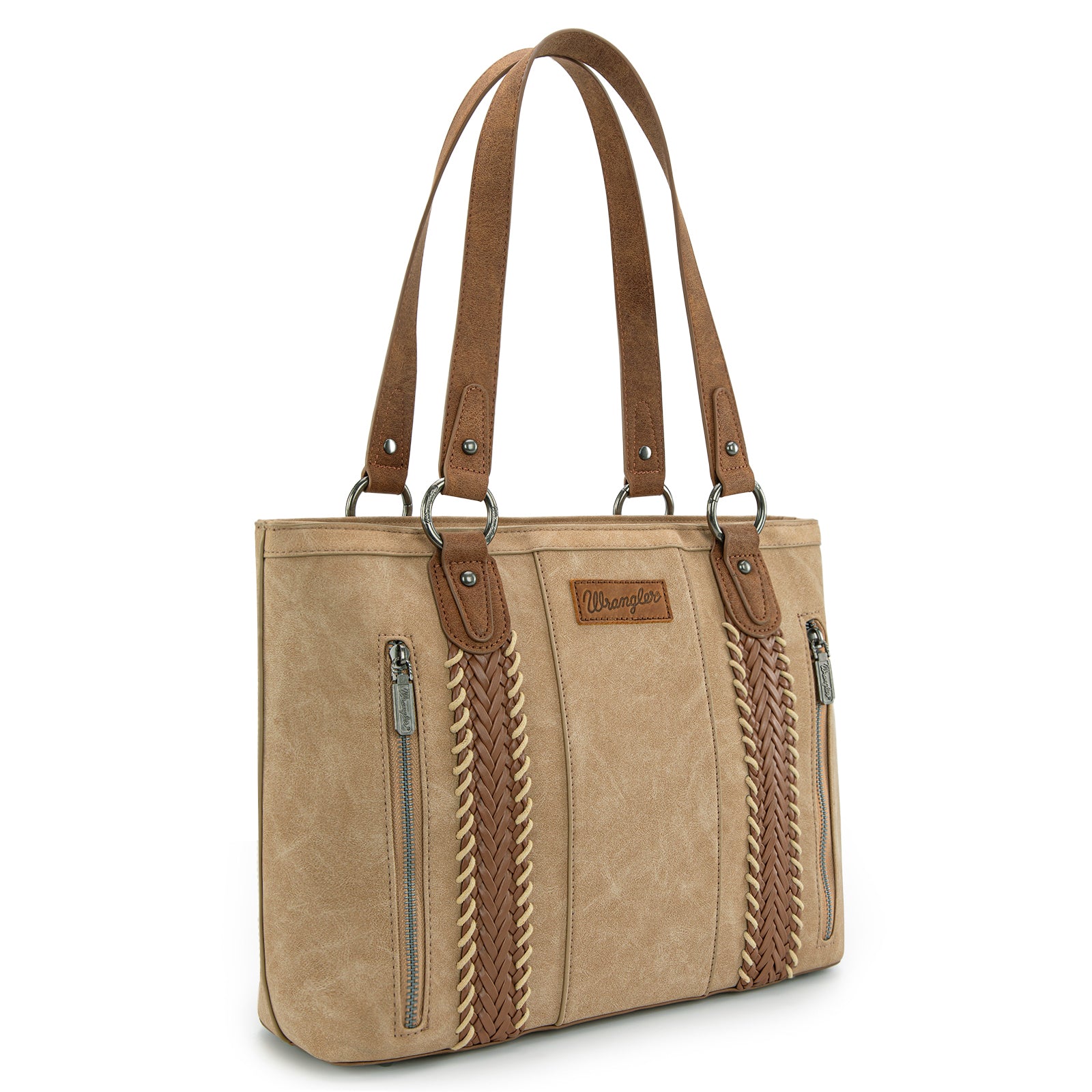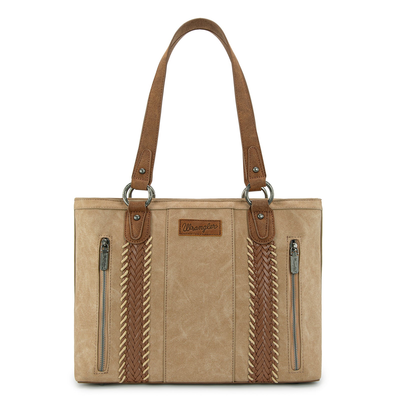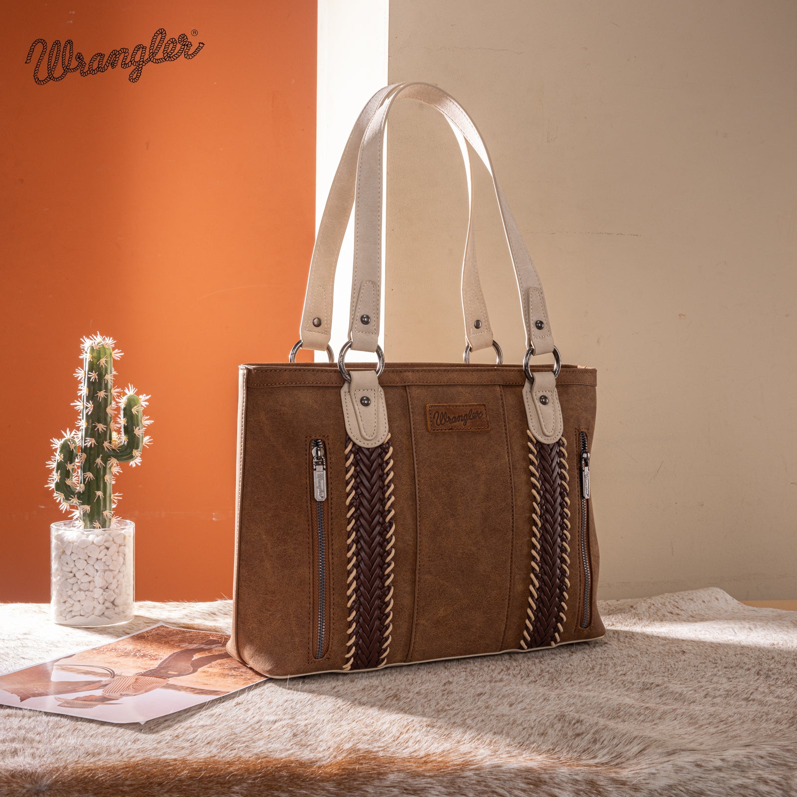 Timeless western charm with everyday versatility. This Wrangler tote features eye-catching braided panels with whipstitch accents that add texture and rustic appeal.