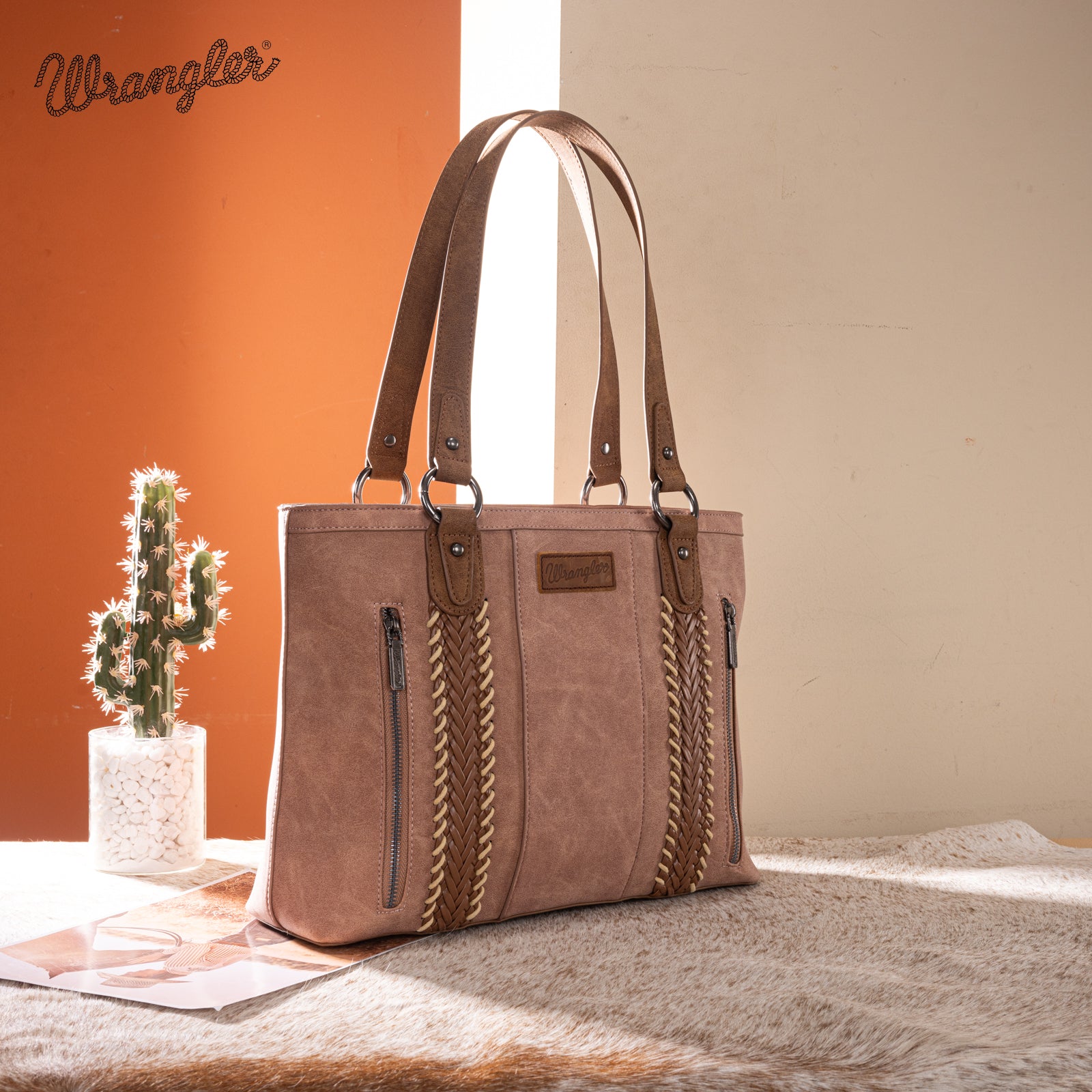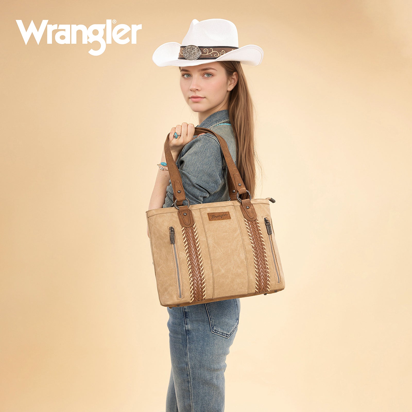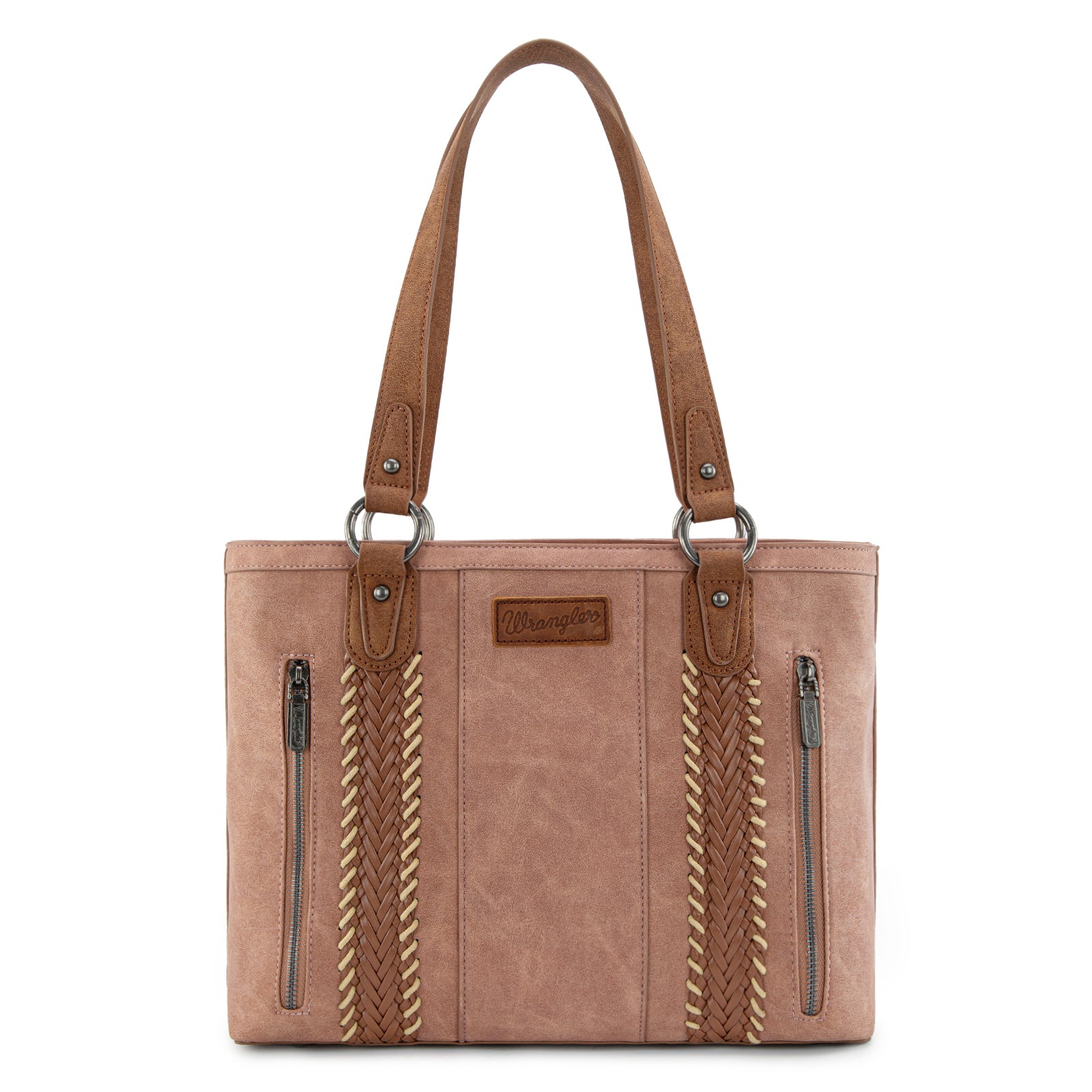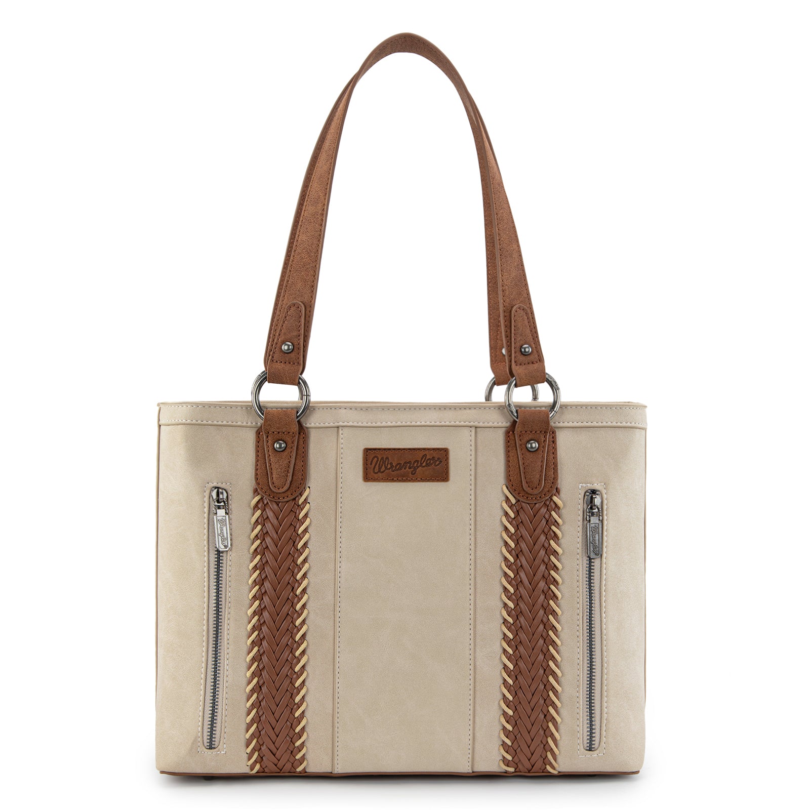 Timeless western charm with everyday versatility. This Wrangler tote features eye-catching braided panels with whipstitch accents that add texture and rustic appeal.