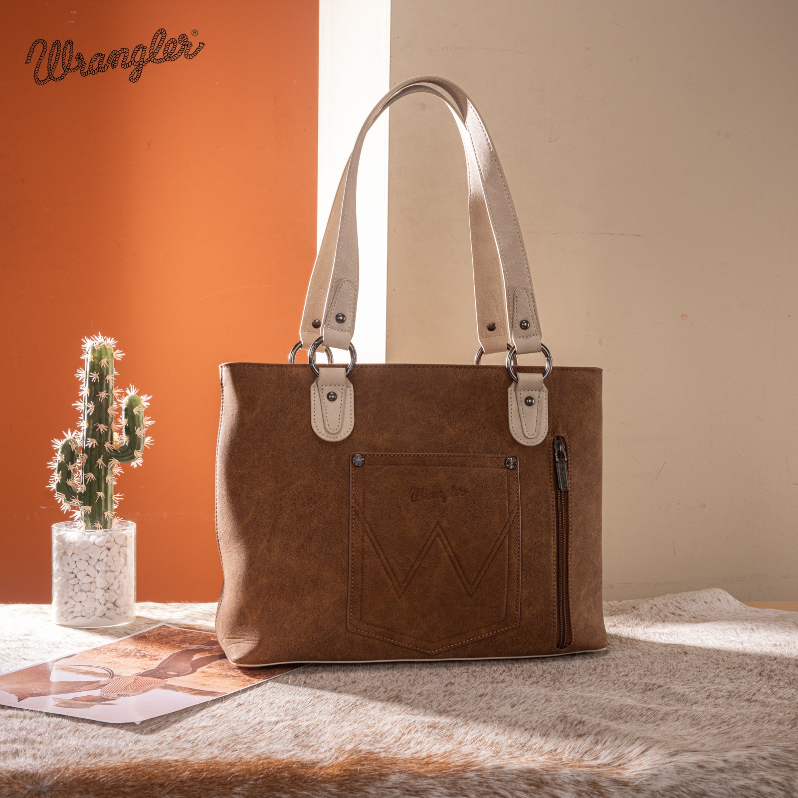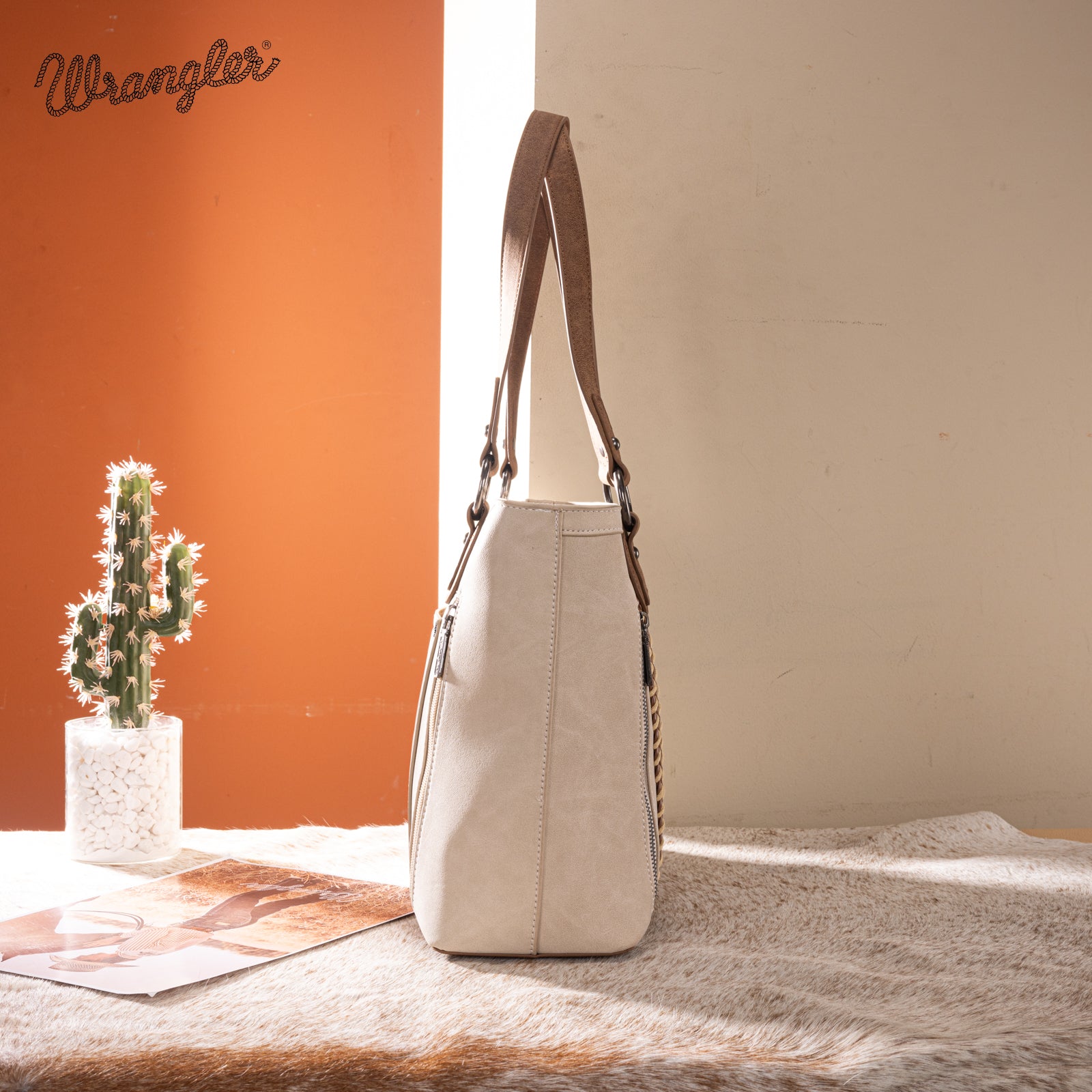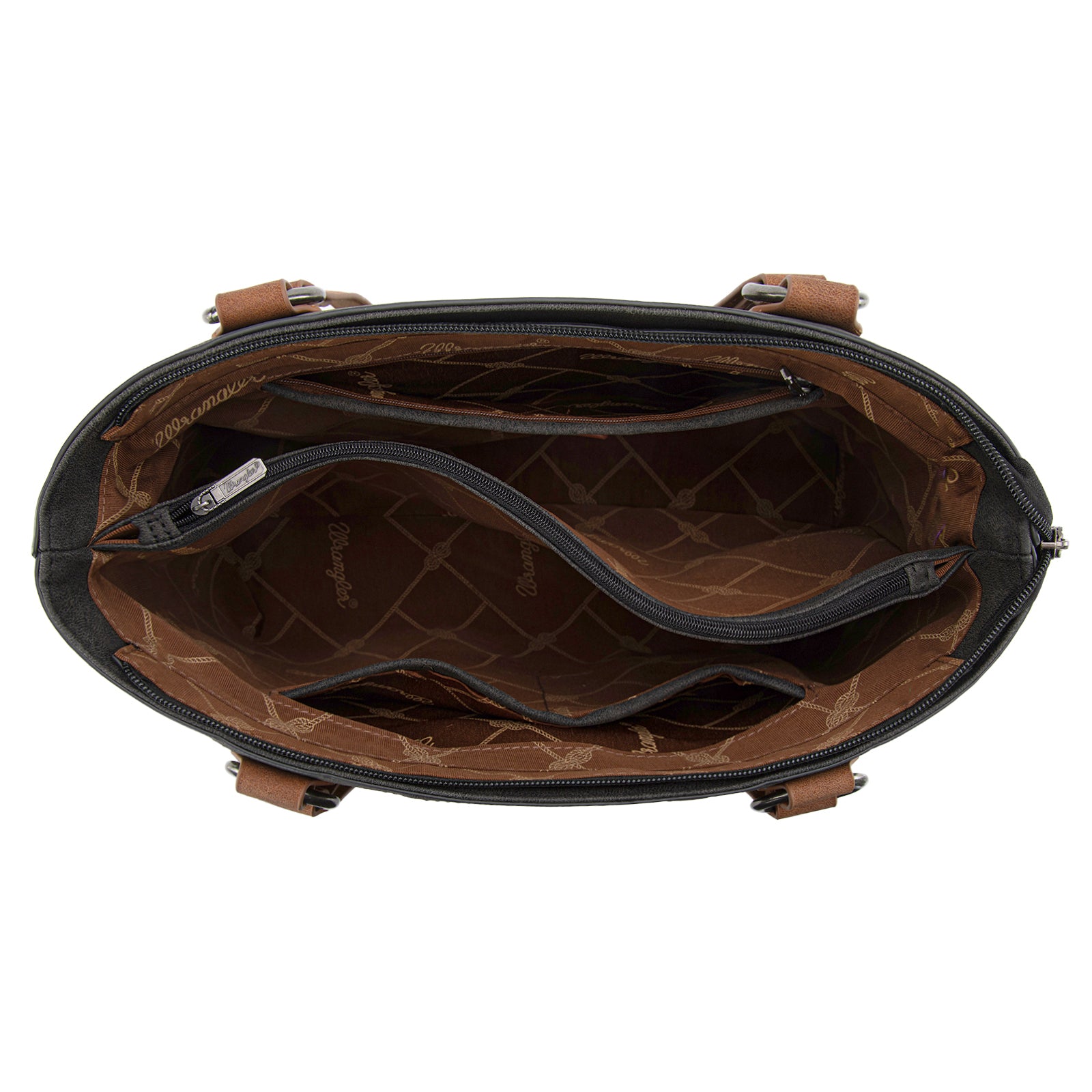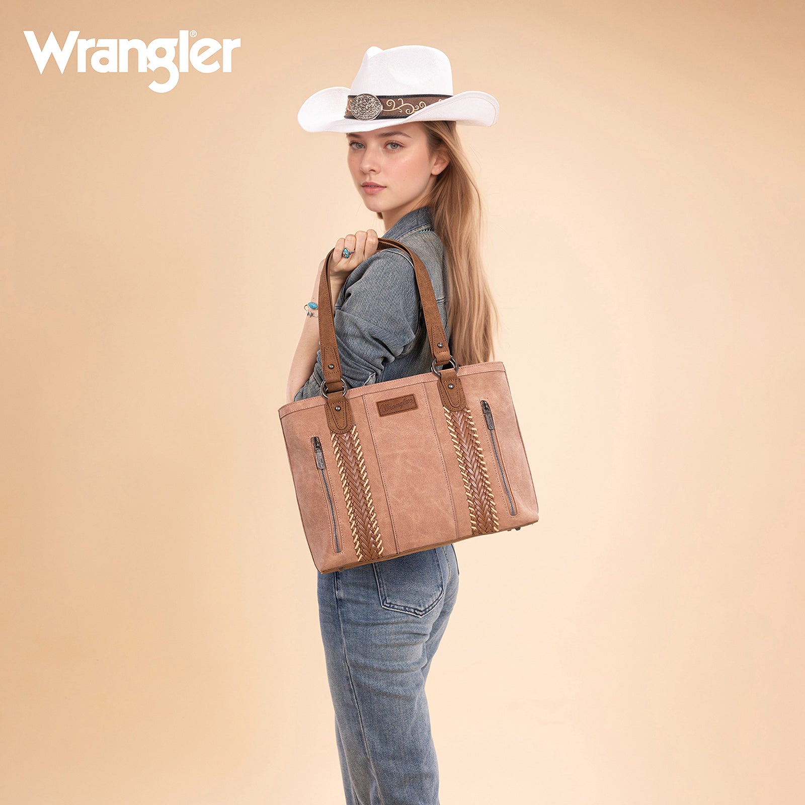 Timeless western charm with everyday versatility. This Wrangler tote features eye-catching braided panels with whipstitch accents that add texture and rustic appeal.