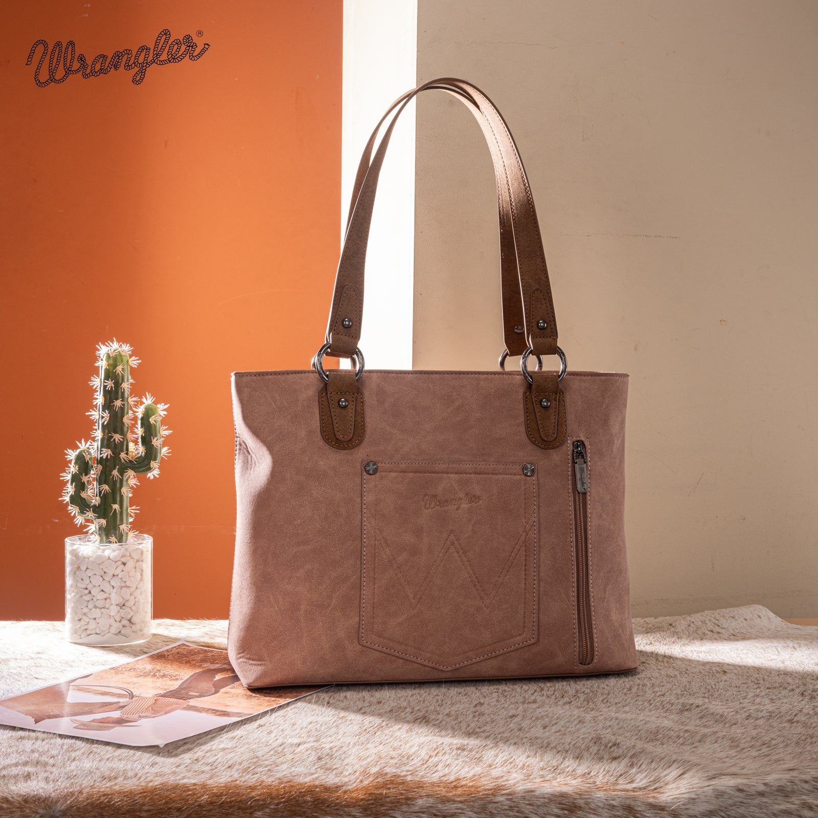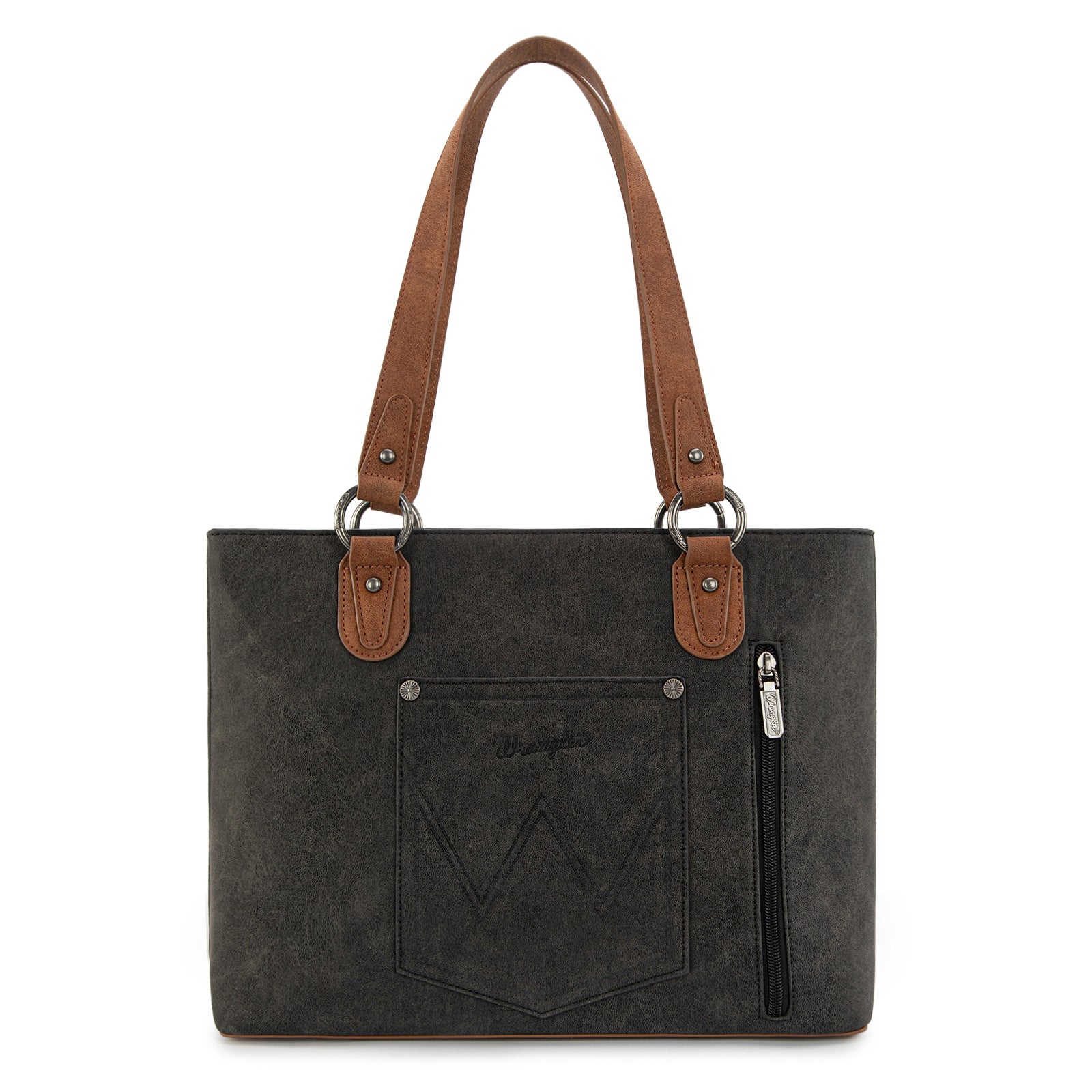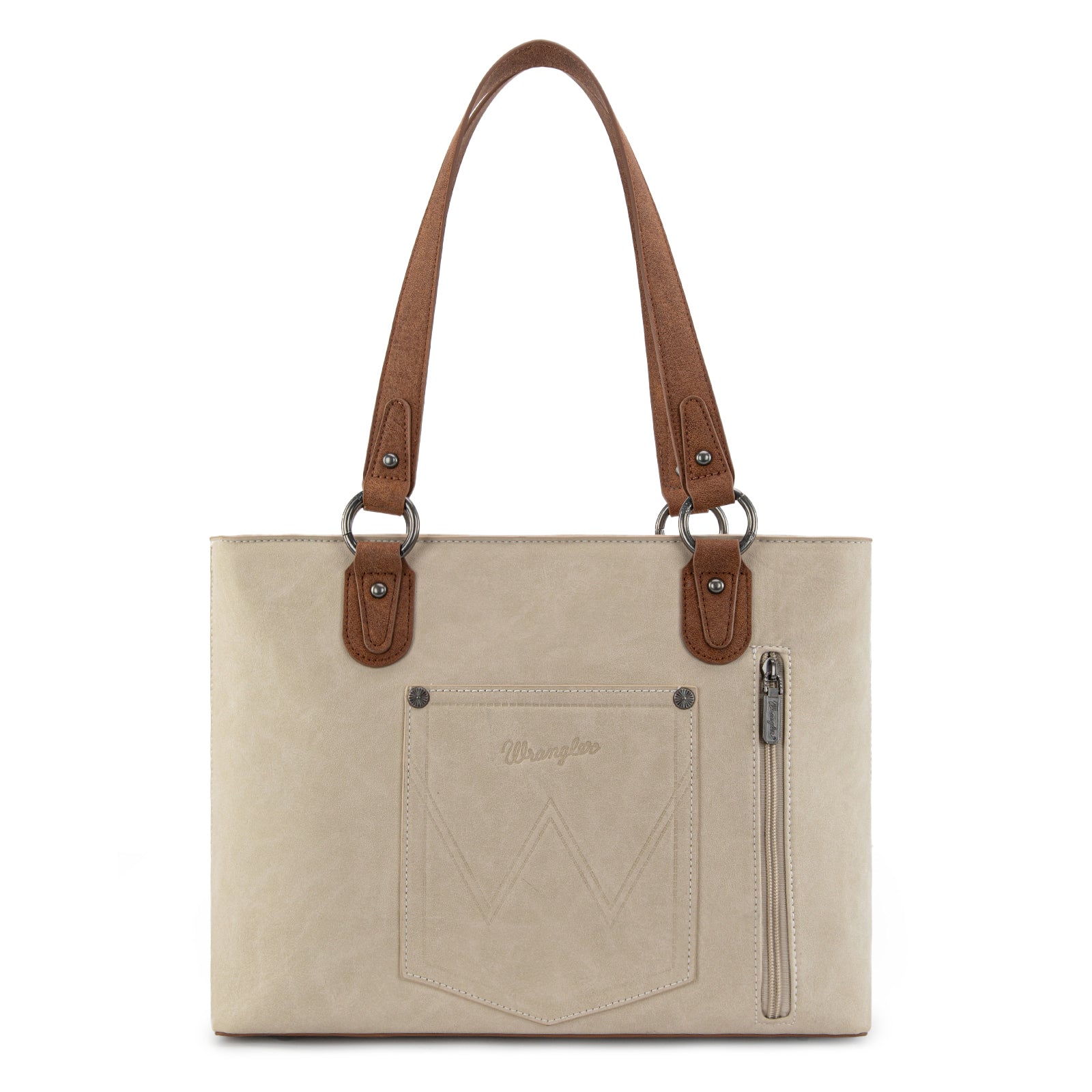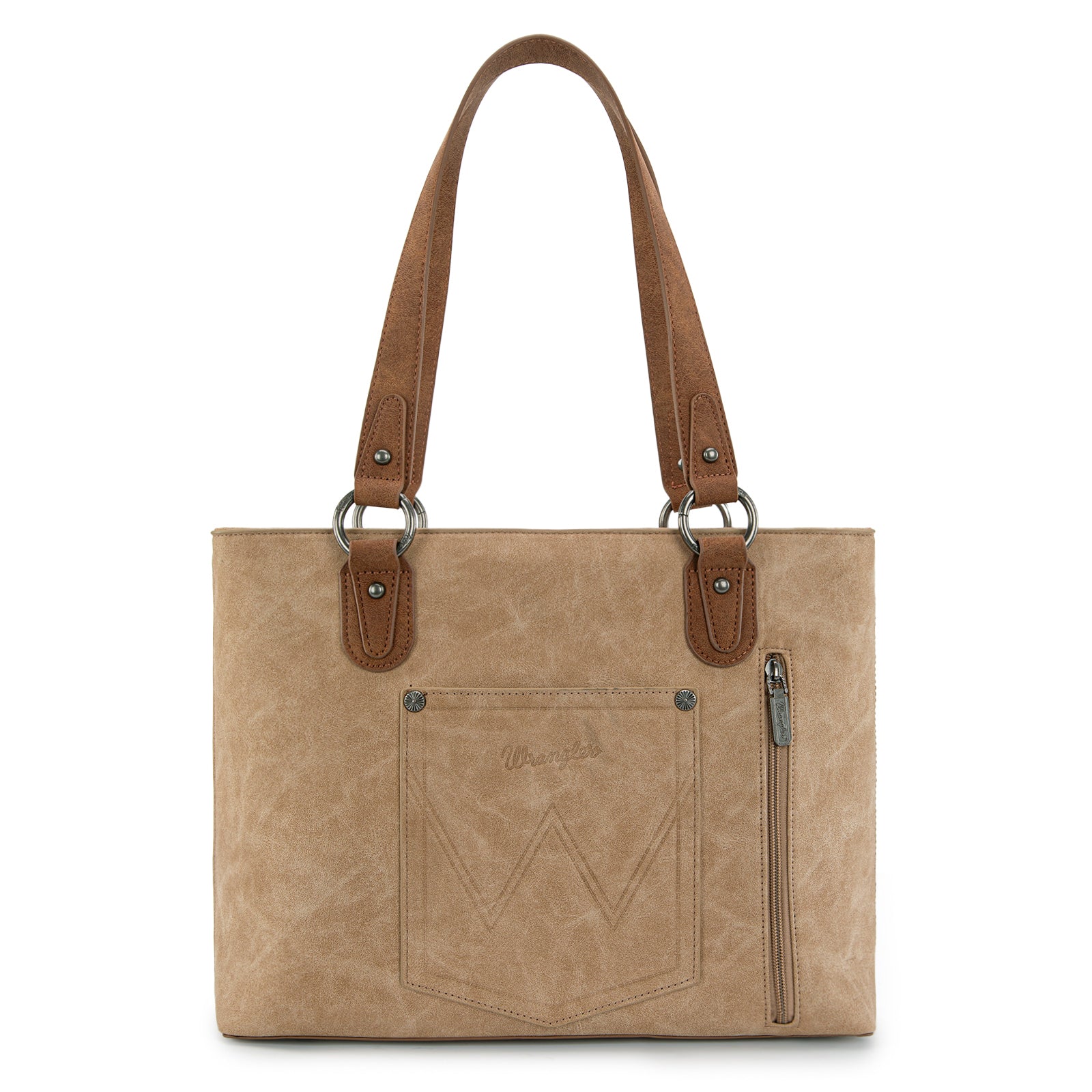 Timeless western charm with everyday versatility. This Wrangler tote features eye-catching braided panels with whipstitch accents that add texture and rustic appeal.