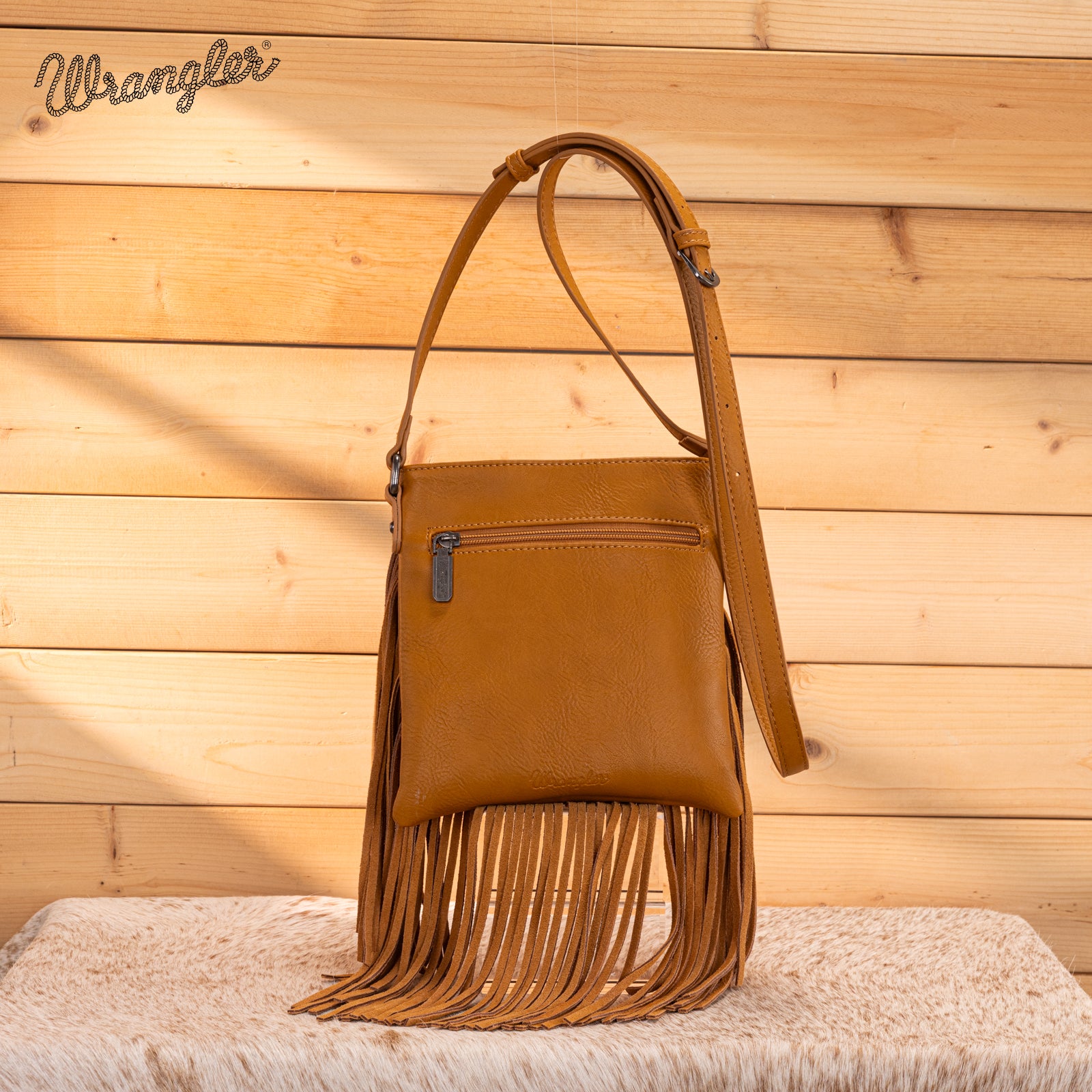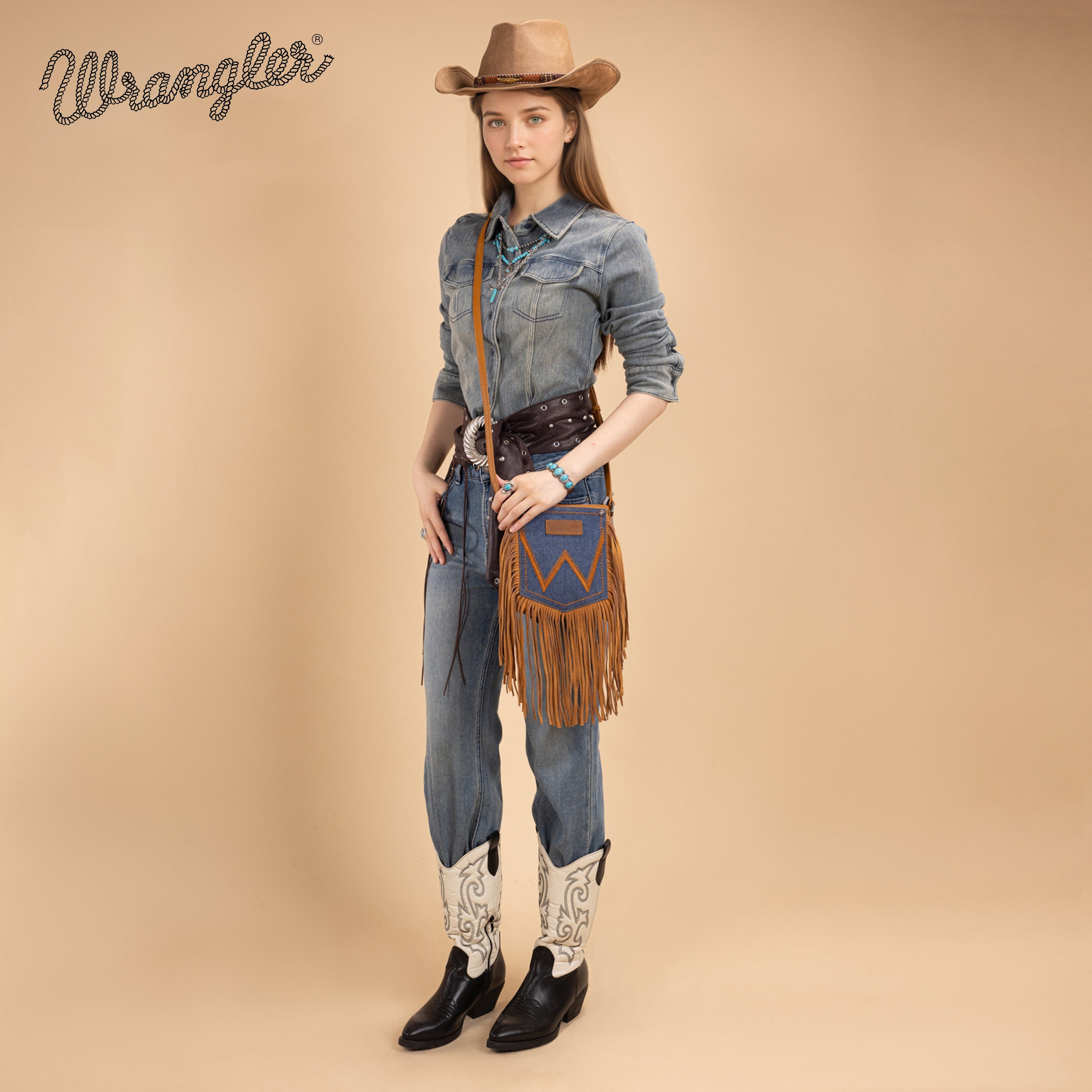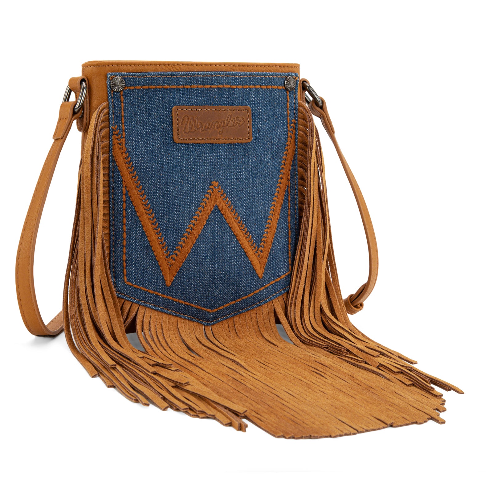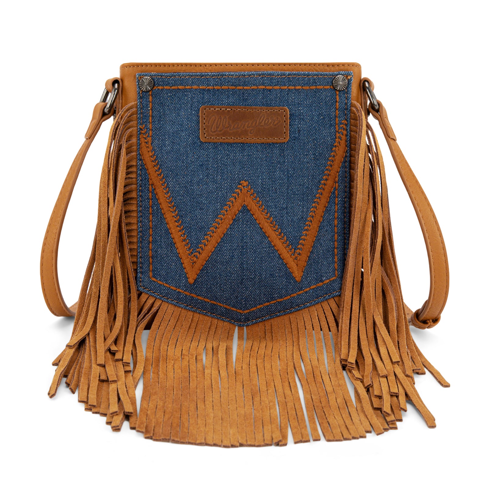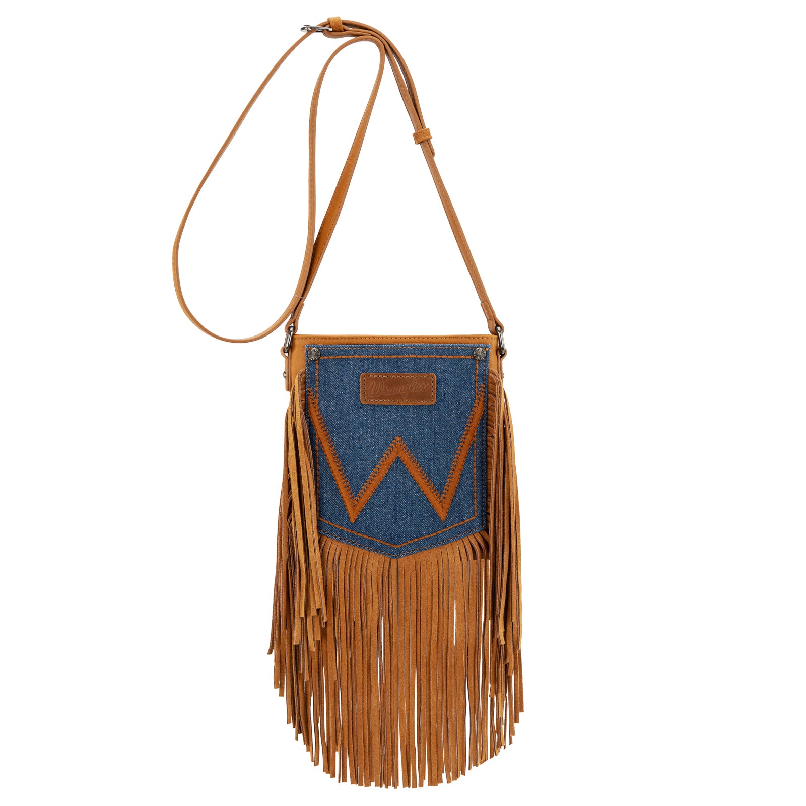 WG367-8360 Wrangler Leather Fringe Jean Denim Pocket Crossbody - Light Brown