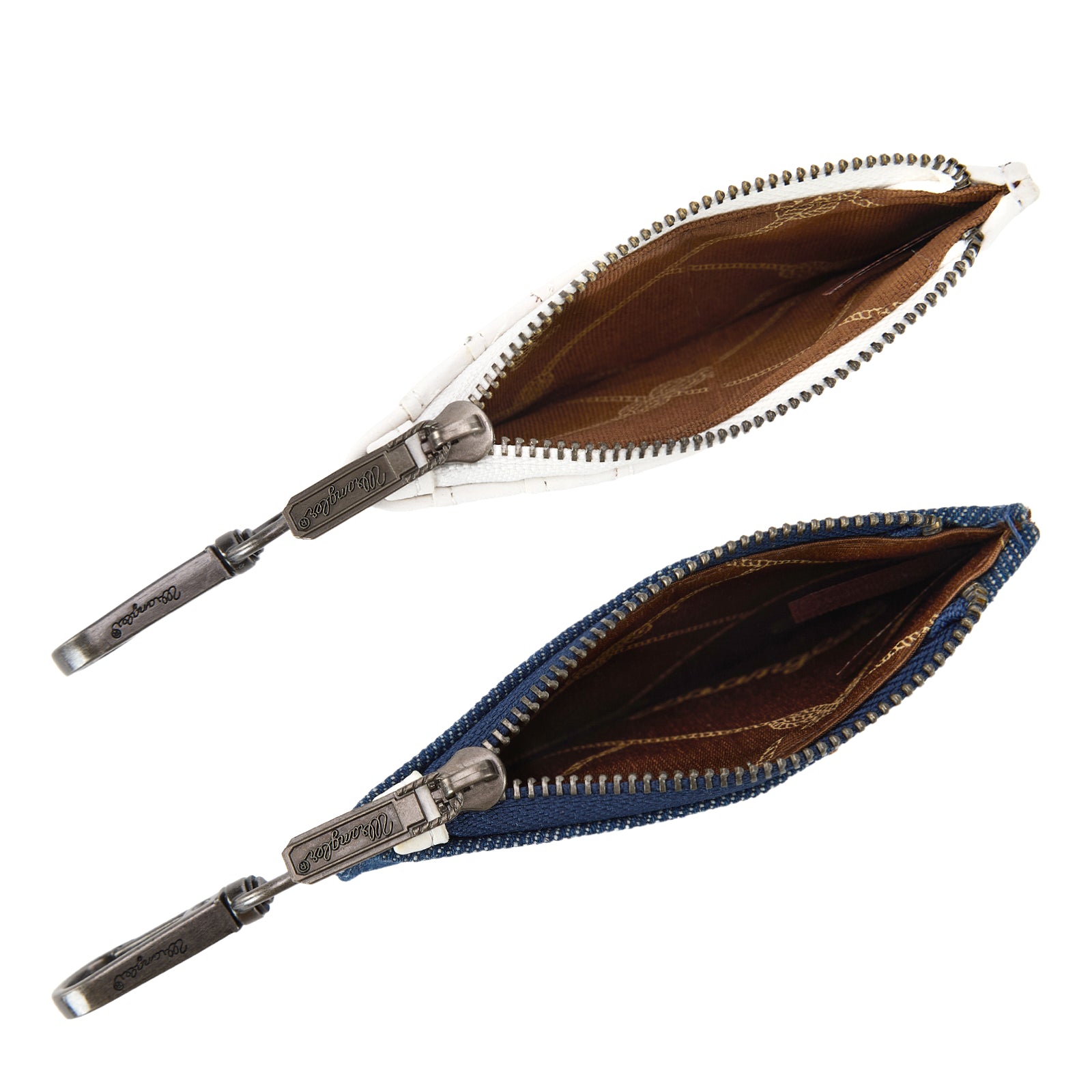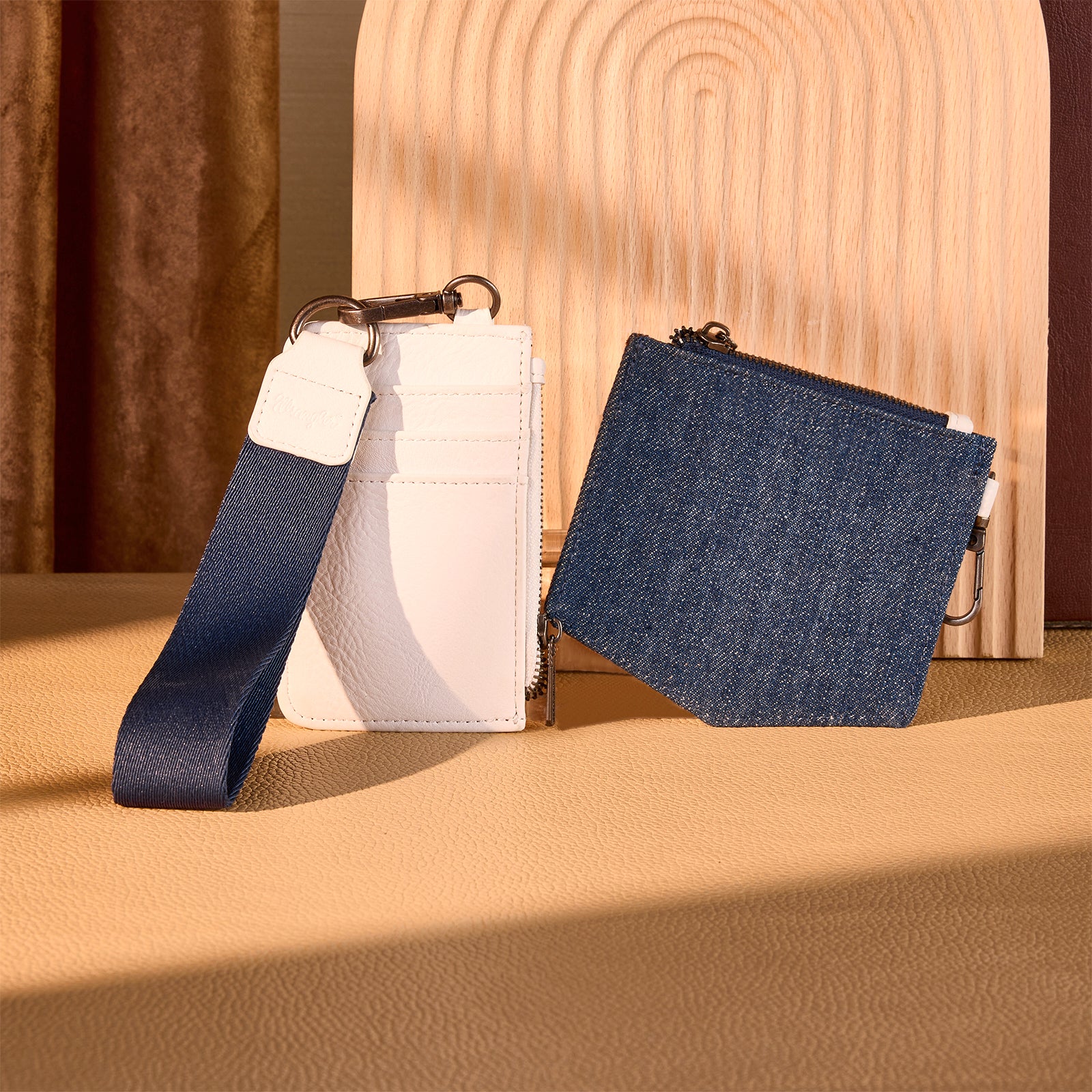 This detachable dual pouch wristlet features a square wallet (card case) and a denim pocket coin purse and a wristlet