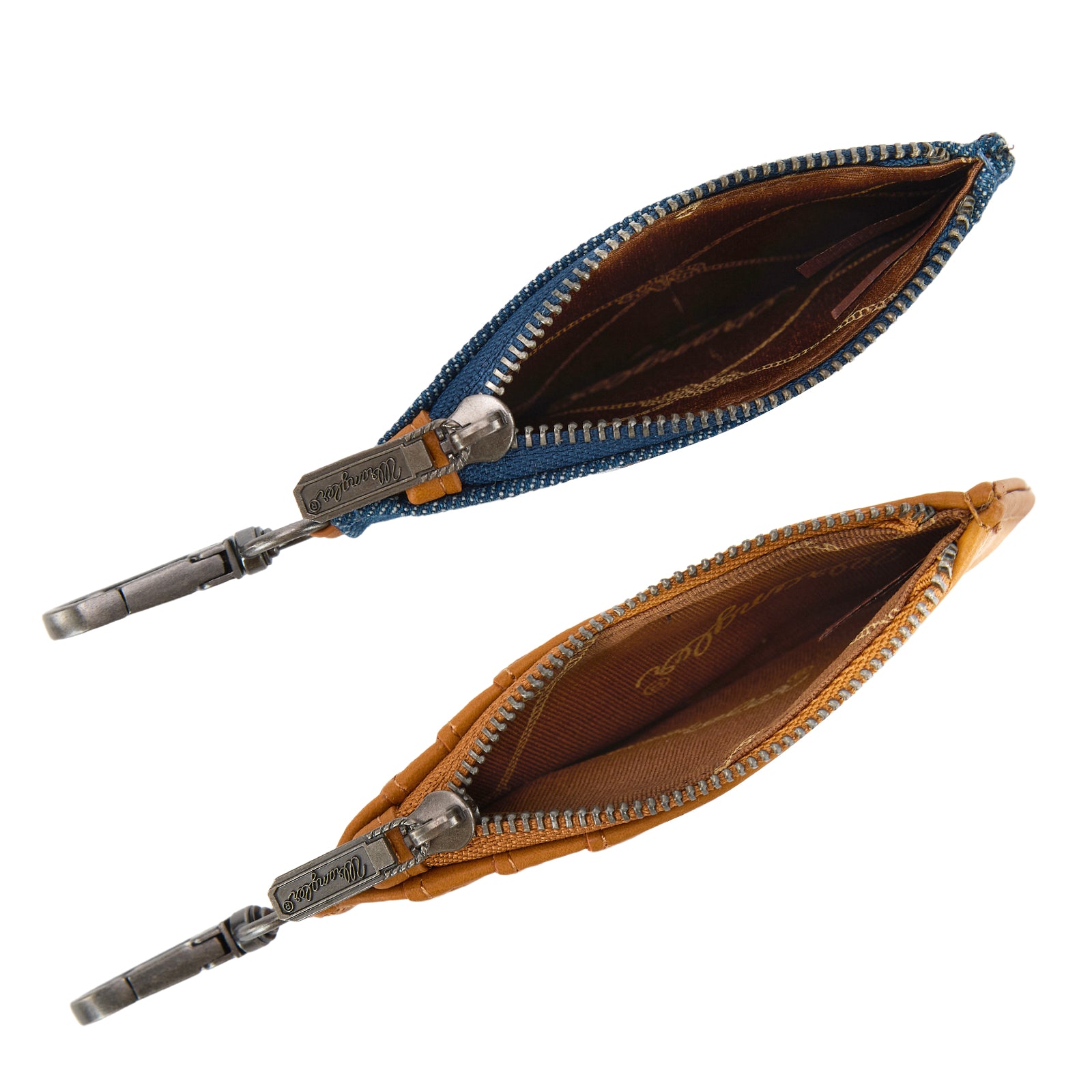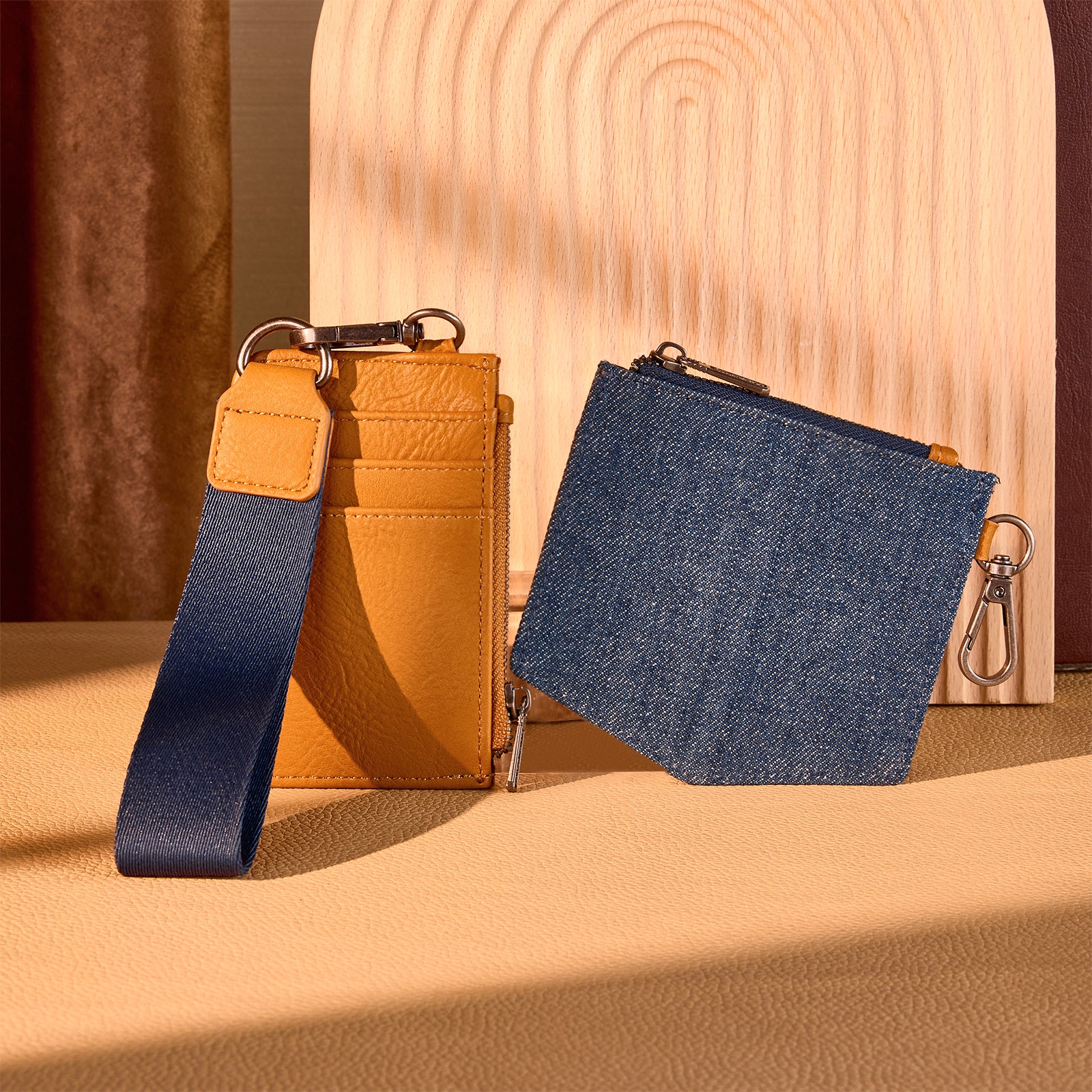 This detachable dual pouch wristlet features a square wallet (card case) and a denim pocket coin purse and a wristlet