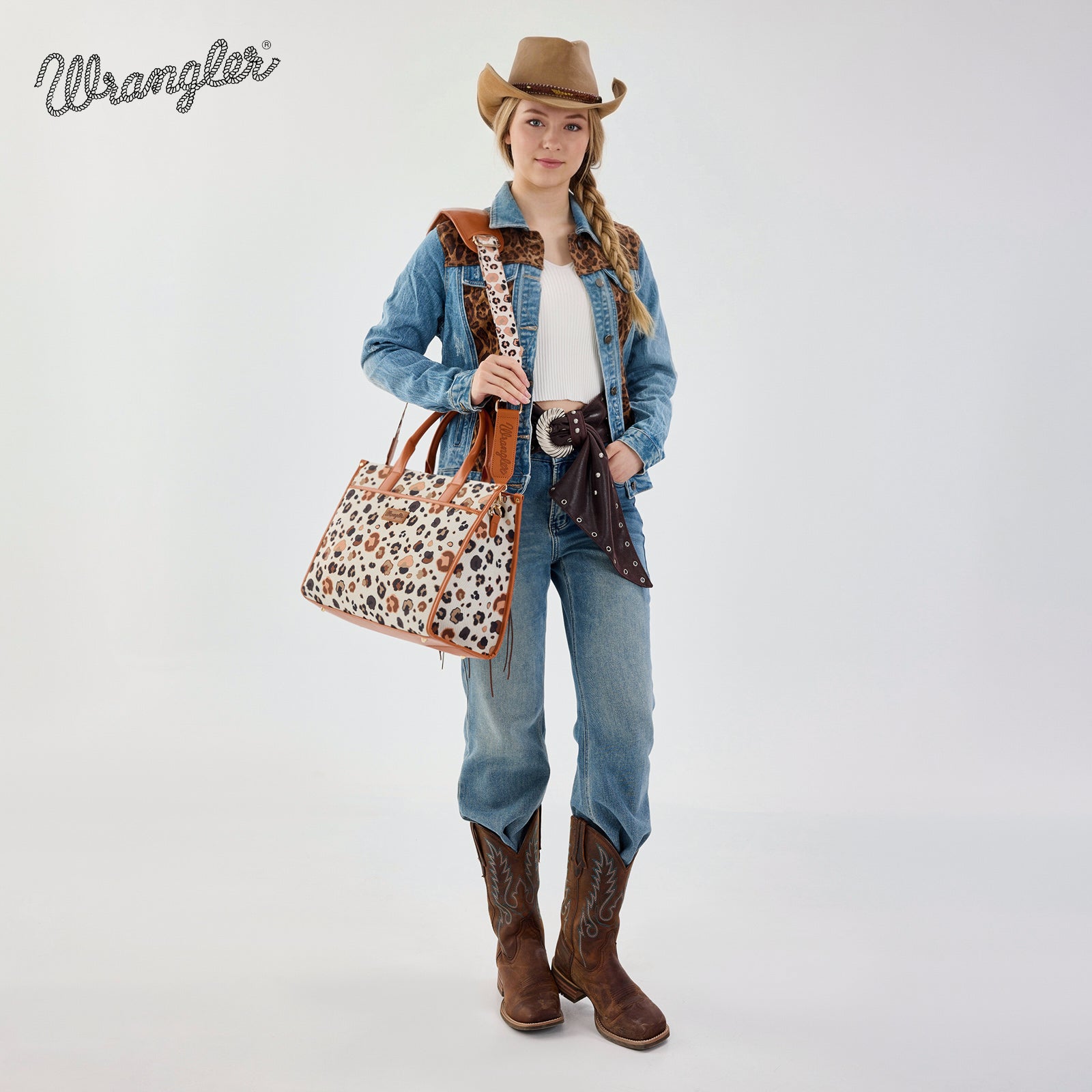 WG436-8119BR Wrangler Leopard Print Canvas Oversized Tote with Adjustable Strap- Brown