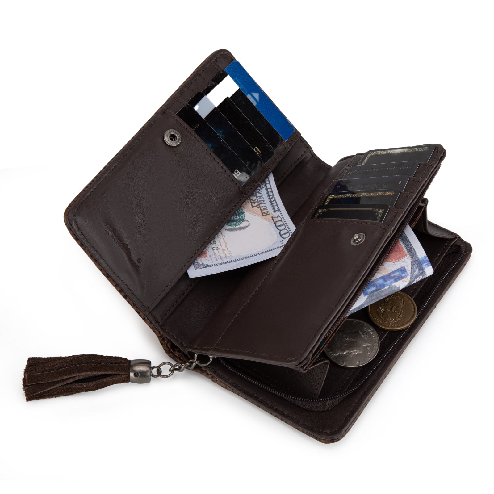 • 8 credit card slots, 2 slide pockets and a zippered compartment
