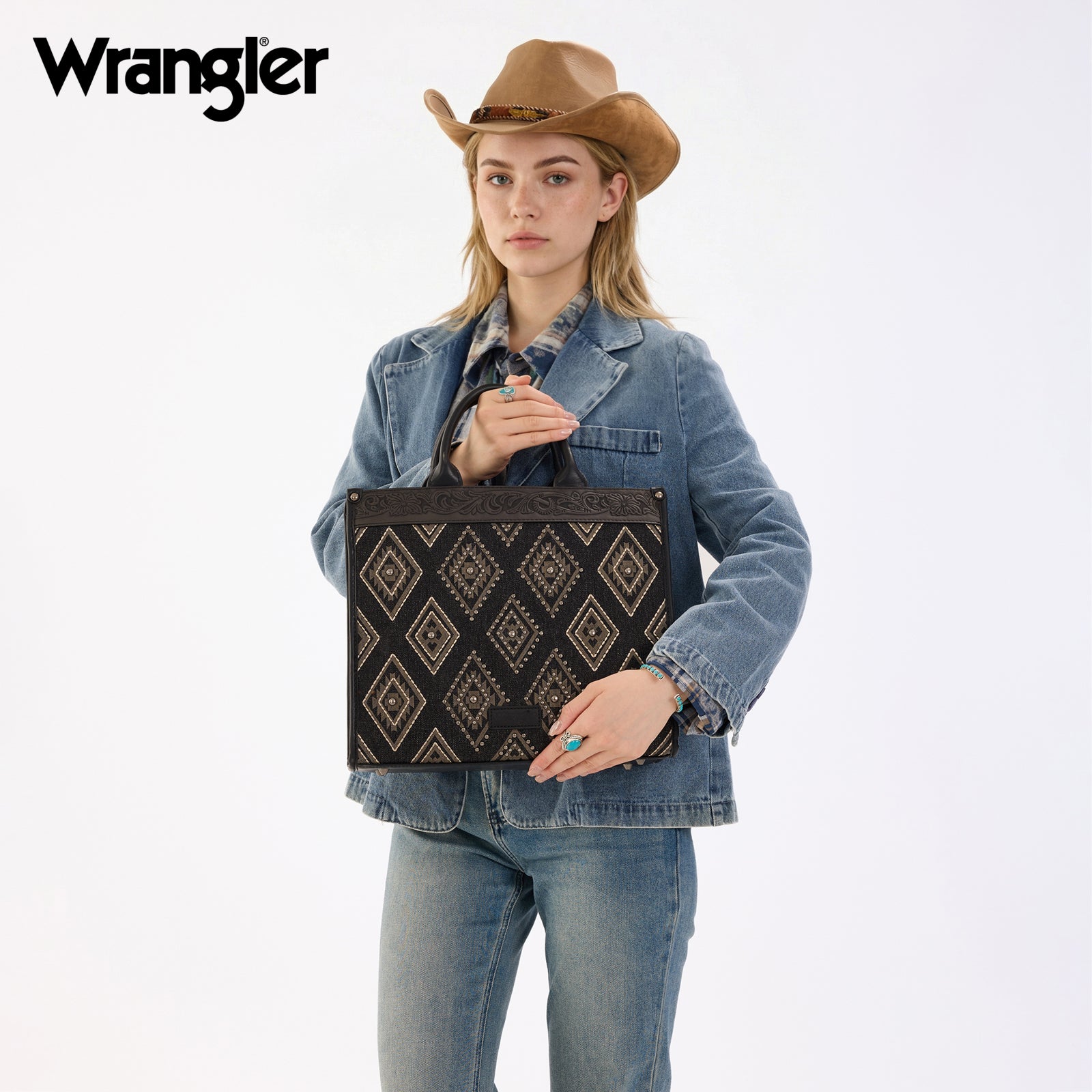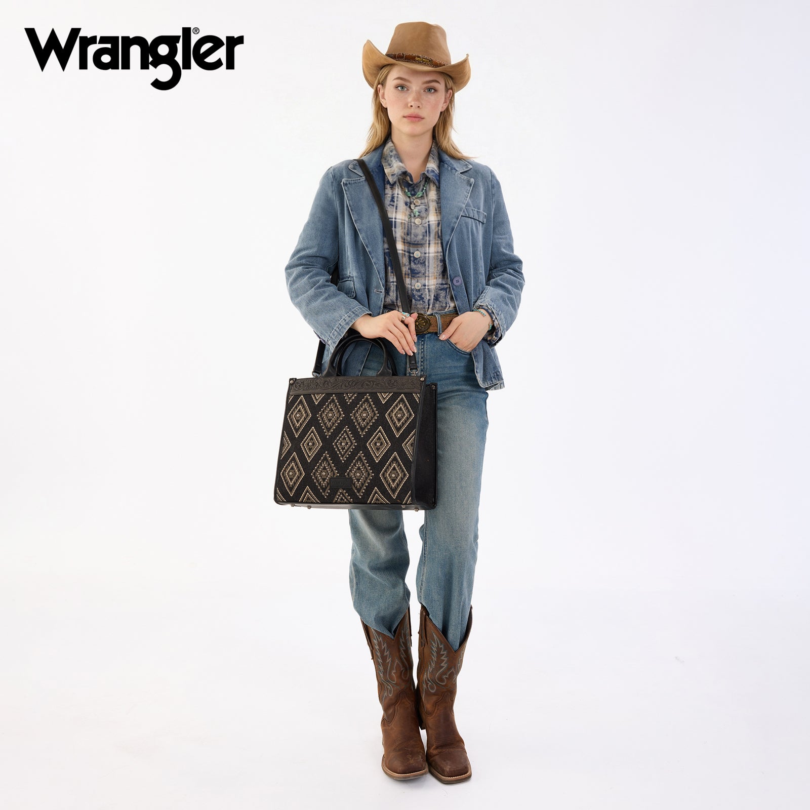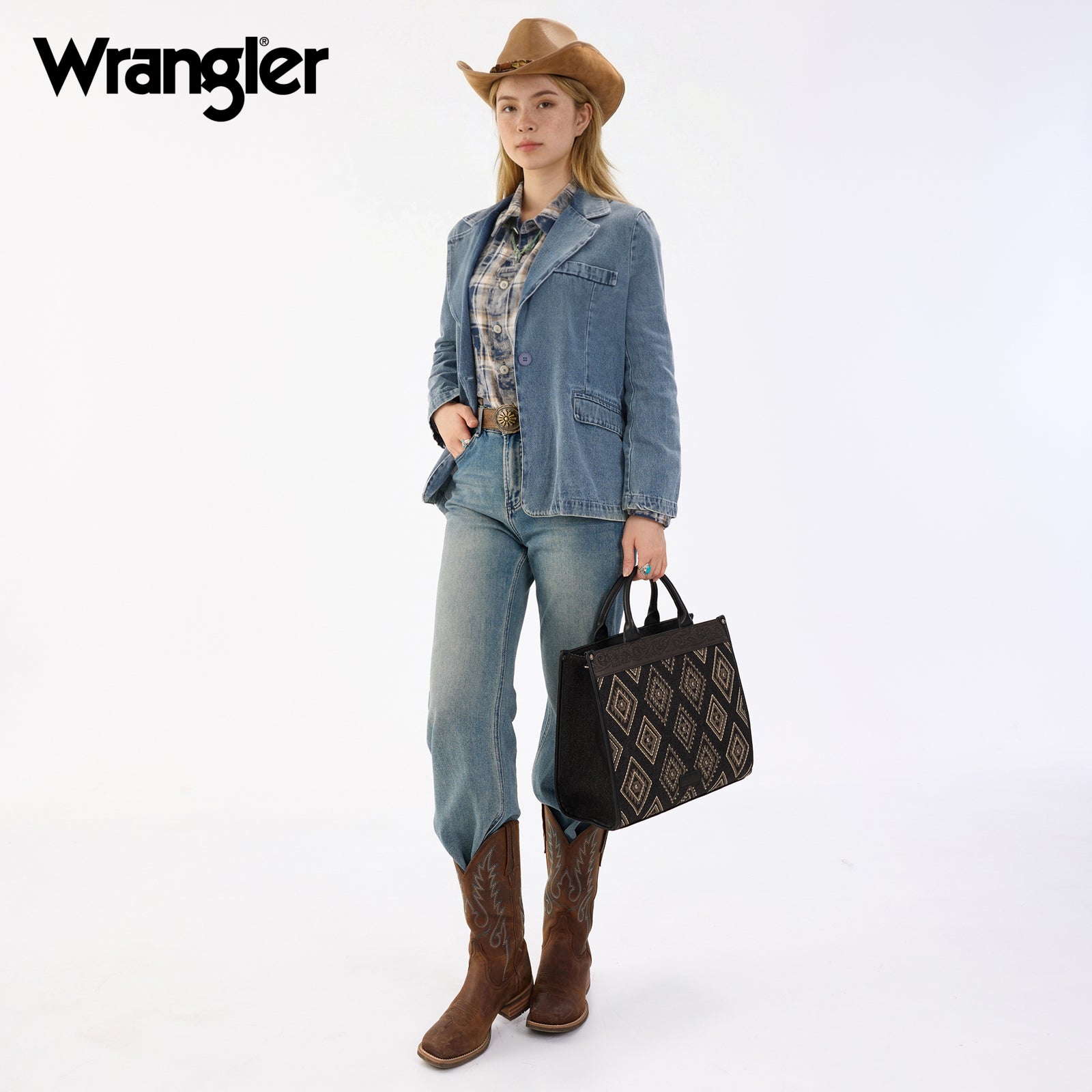 Add a touch of Western charm to your everyday style with this Wrangler tote featuring a bold Aztec-inspired diamond pattern on denim. Accented with tooled detailing and decorated with antique studs, this bag blends rustic Western character with modern functionality.