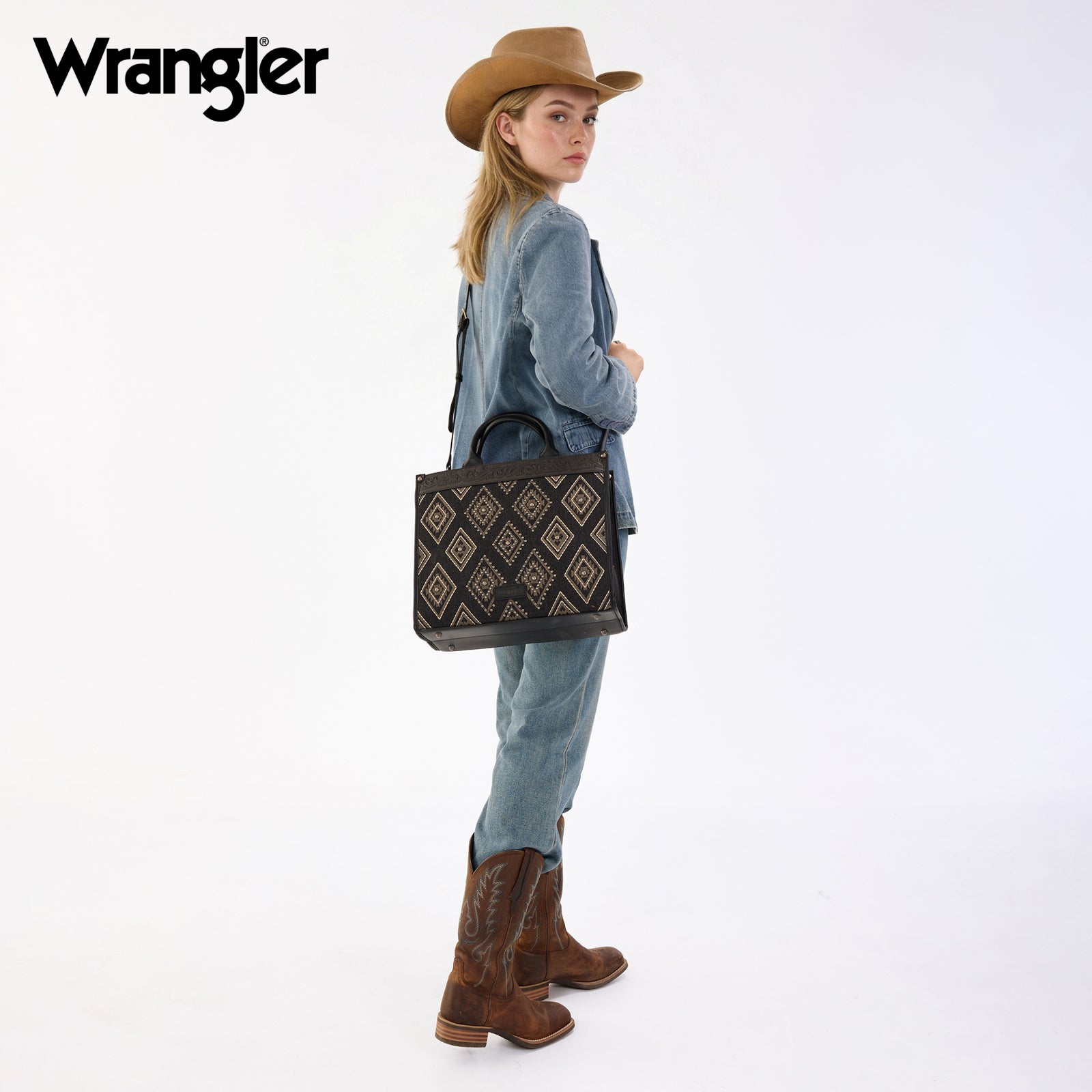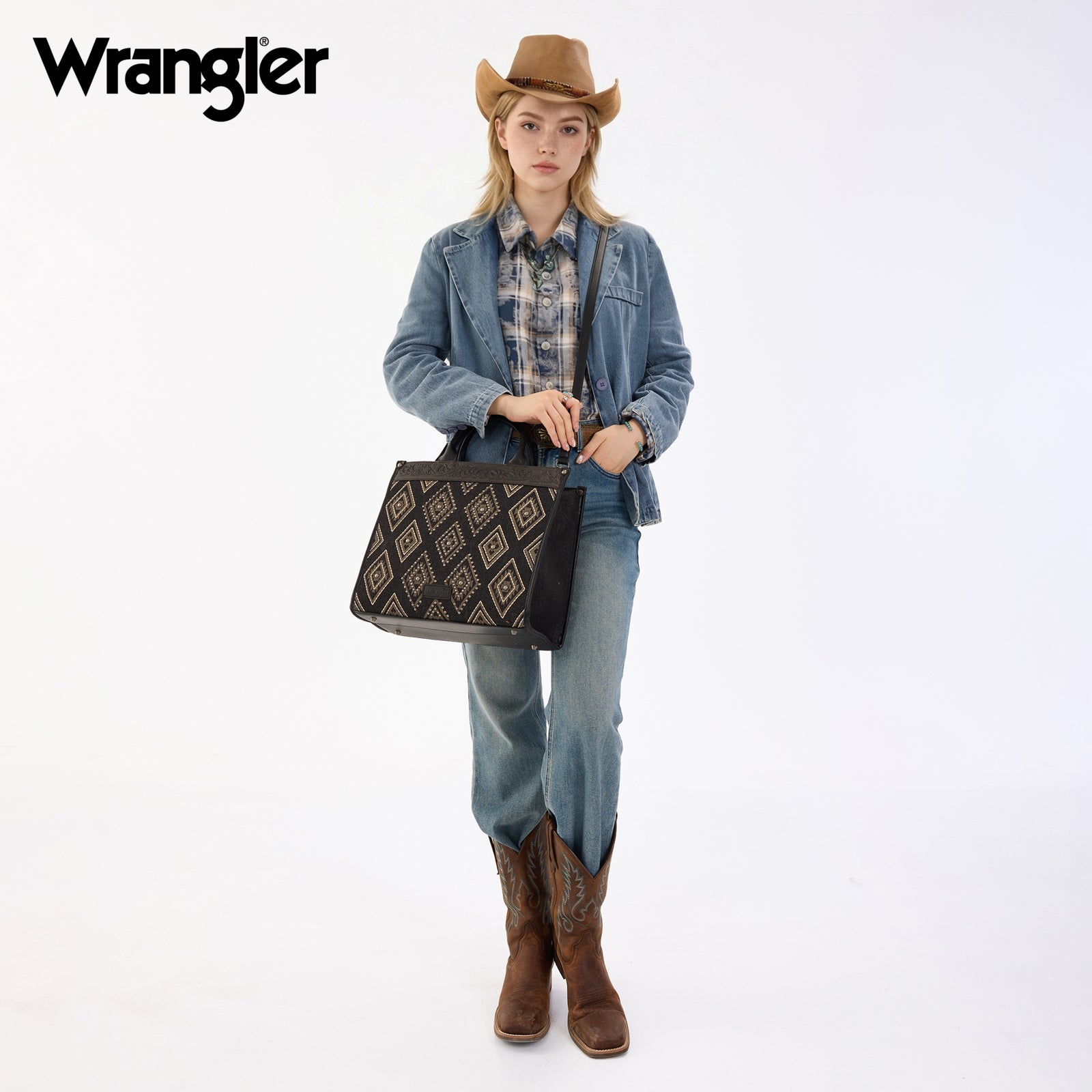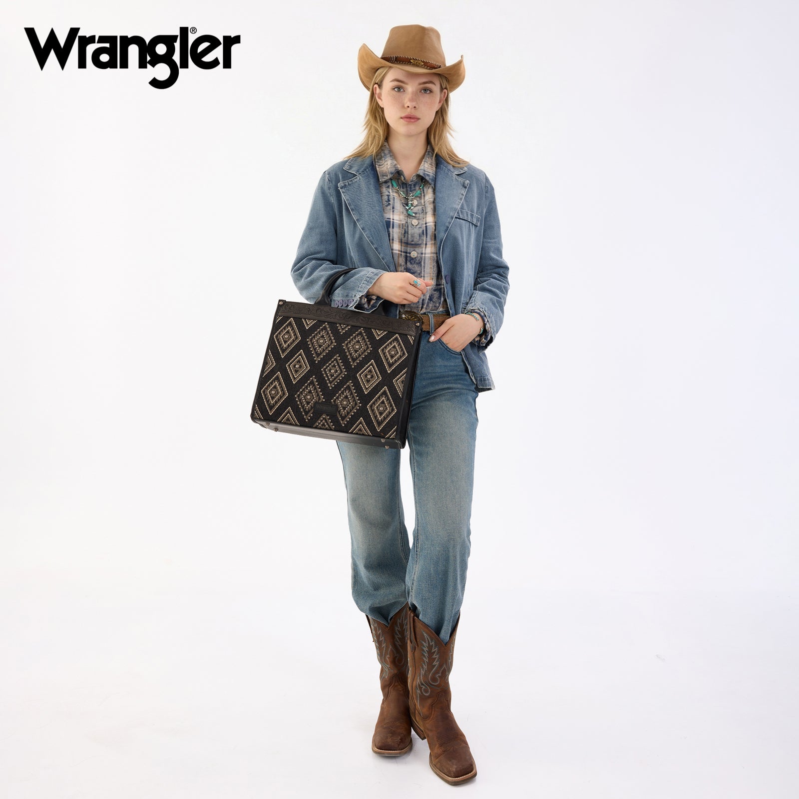 Add a touch of Western charm to your everyday style with this Wrangler tote featuring a bold Aztec-inspired diamond pattern on denim. Accented with tooled detailing and decorated with antique studs, this bag blends rustic Western character with modern functionality.