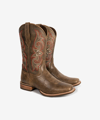 With supple leather and vintage hues, these women's cowboy boots pair intricate embroidery with four-row stitching for arena-ready style and all-day comfort