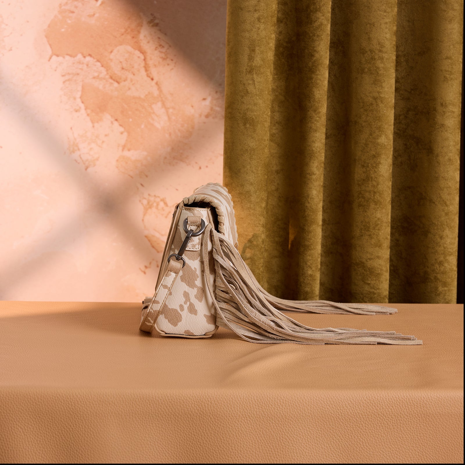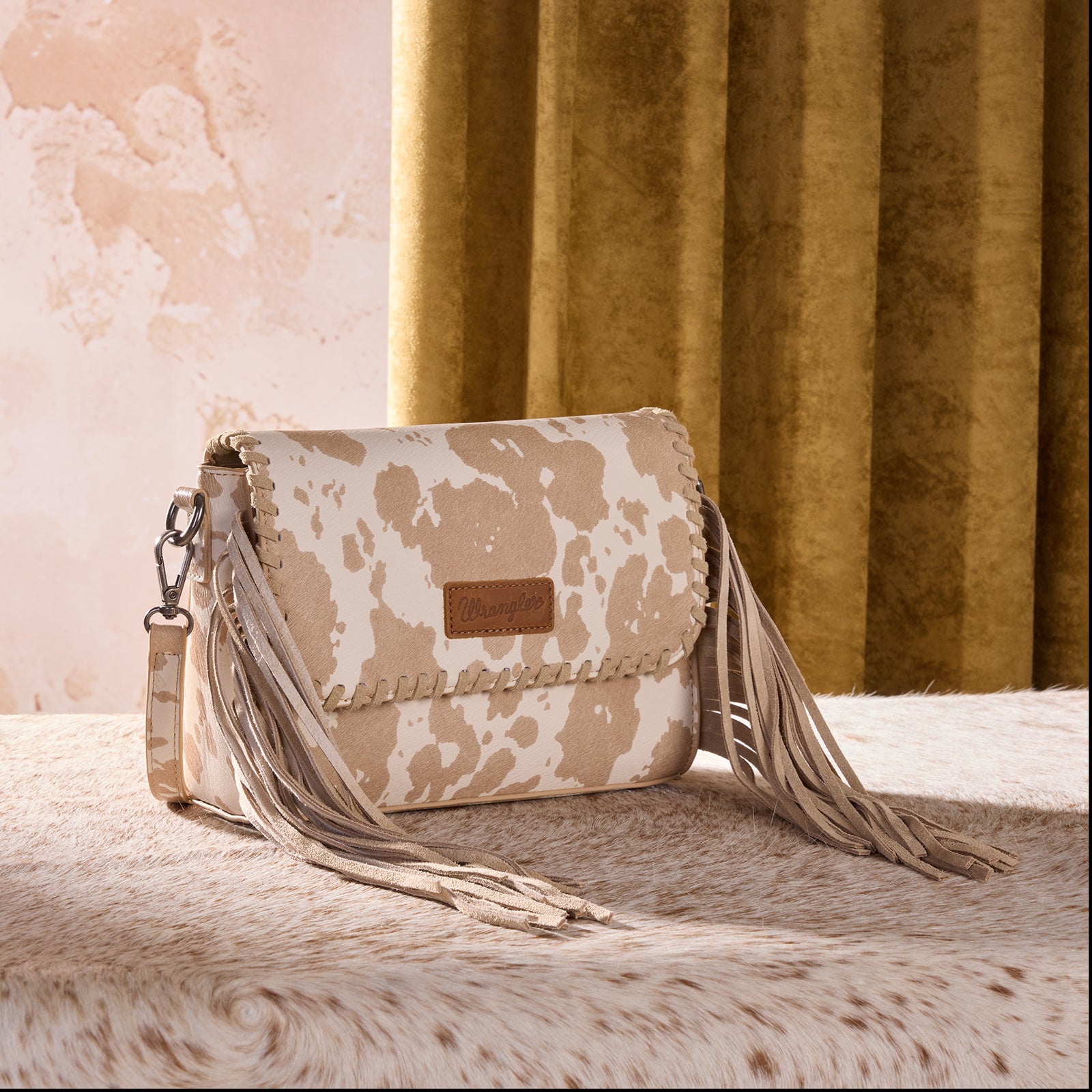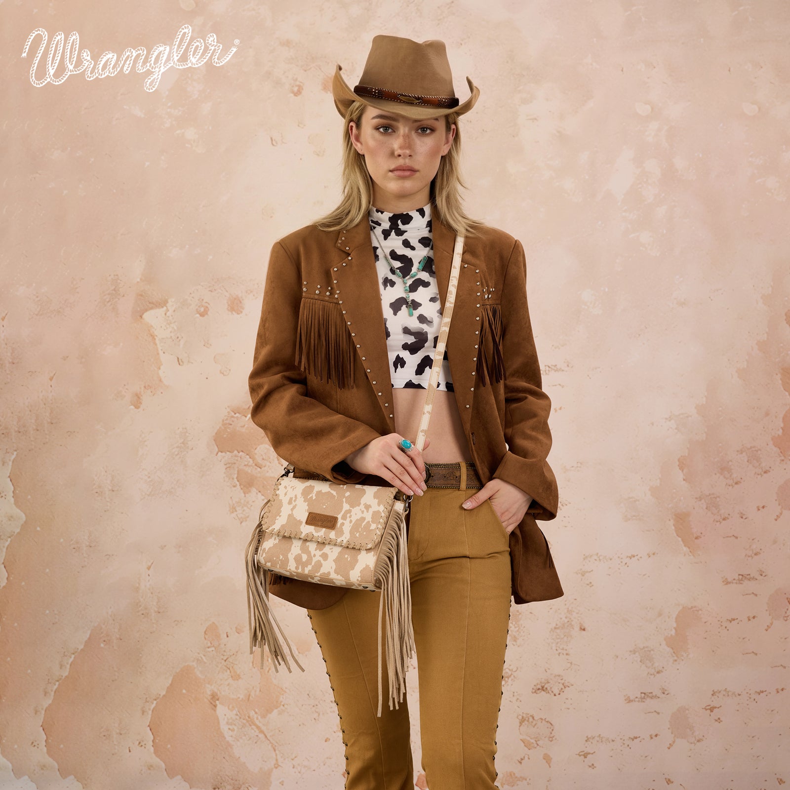 WG444-1818TN Wrangler Cow Print Fringe Crossbody Bag -Tan