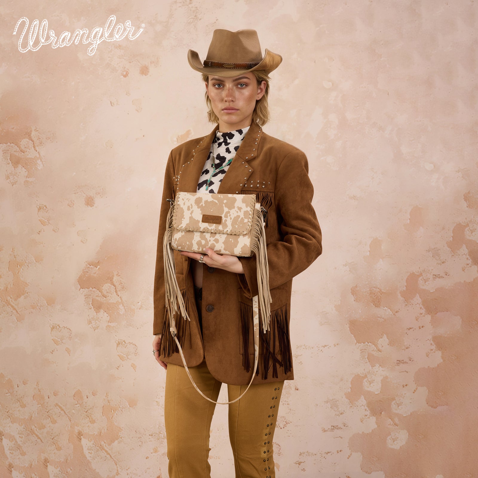 Add a fun Western flair to your outfit with this stylish Wrangler cow print crossbody bag. , This bag is accented with classic whipstitch detailing and soft suede fringe on both sides for the perfect Western-boho vibe.