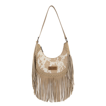 WG444-818TN Wrangler Cow Print Fringe Shoulder Hobo Bag -Tan