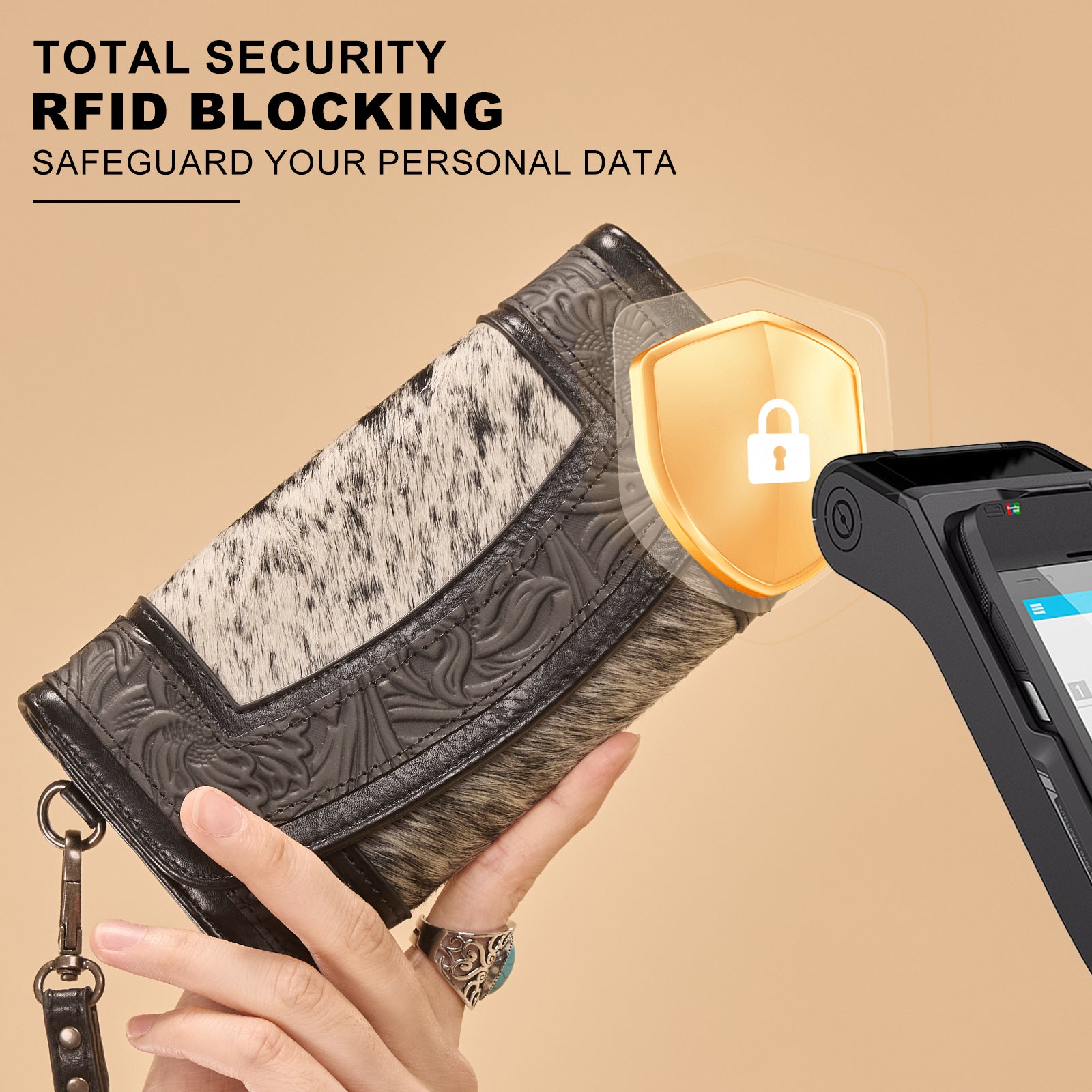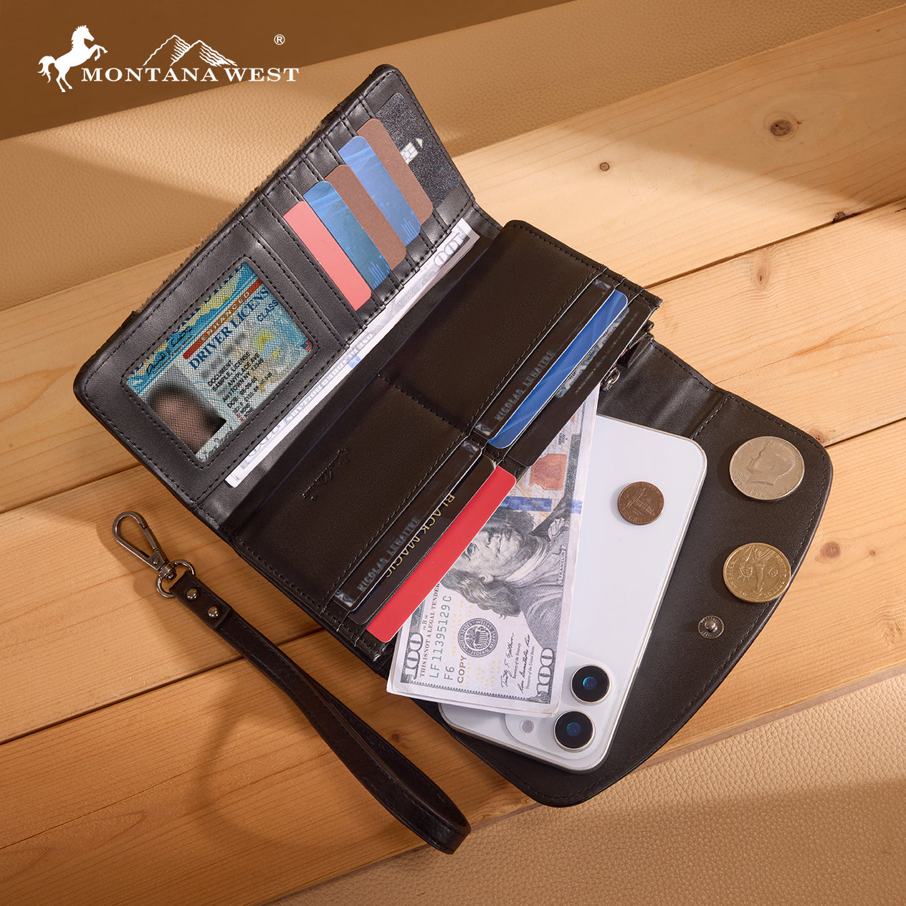 MW1360-W018 Montana West Hair-On Hide Tooled Wallet – Western Wristlet - Black