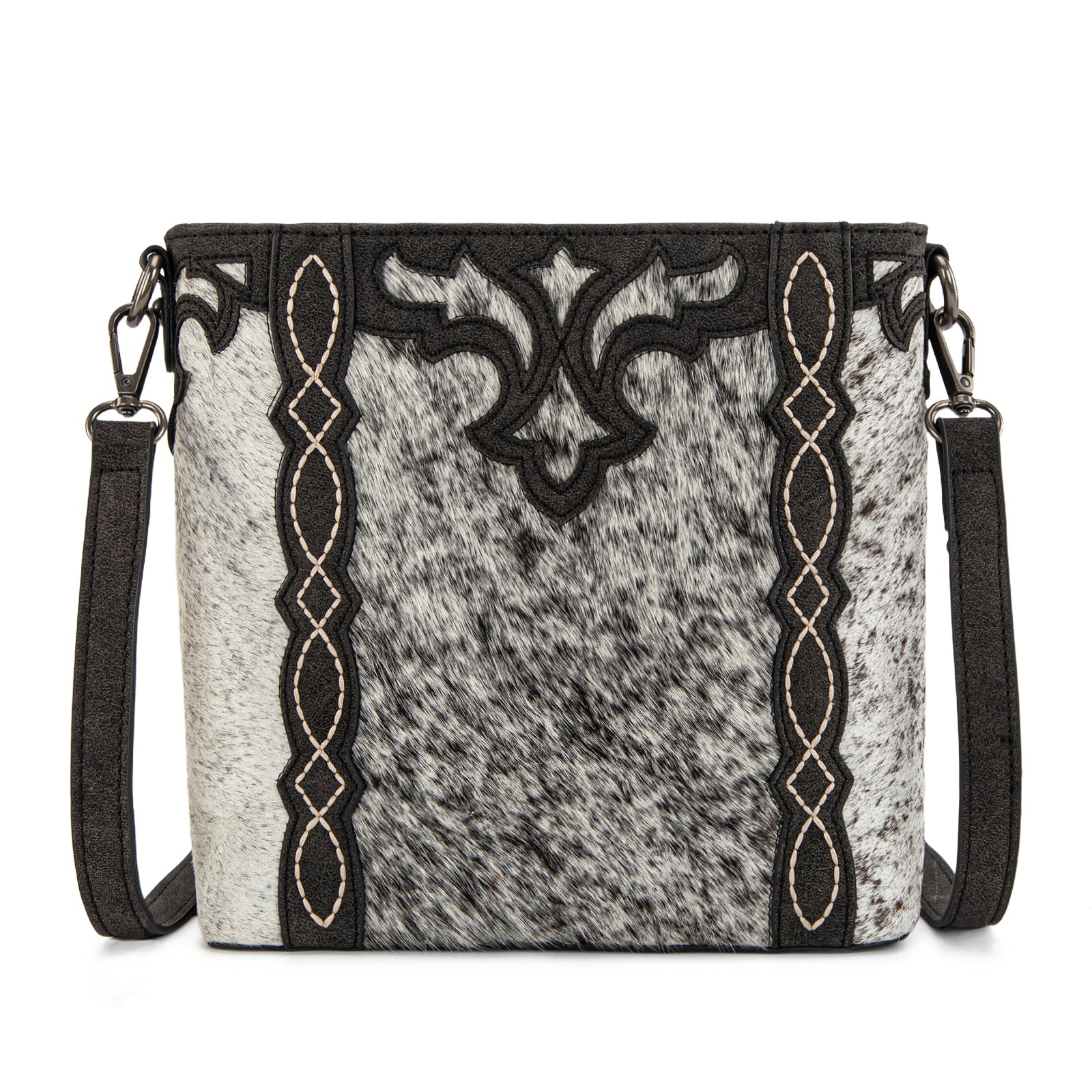 Make a bold western statement with this eye-catching mini tote. Featuring genuine hair-on cowhide on the front panel and a striking western applique design, this bag blends rustic charm with everyday functionality.