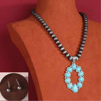 Navajo Beaded Necklace with Howlite Turquoise Stone Pendant Earrings Set