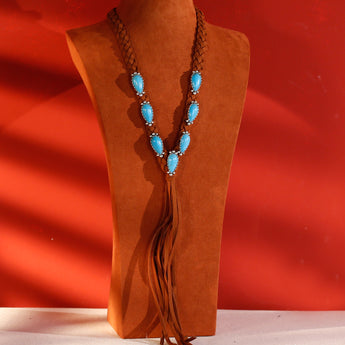 Braided leather stone concho tassel necklace