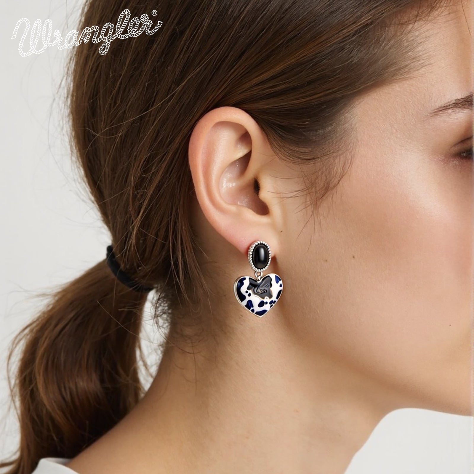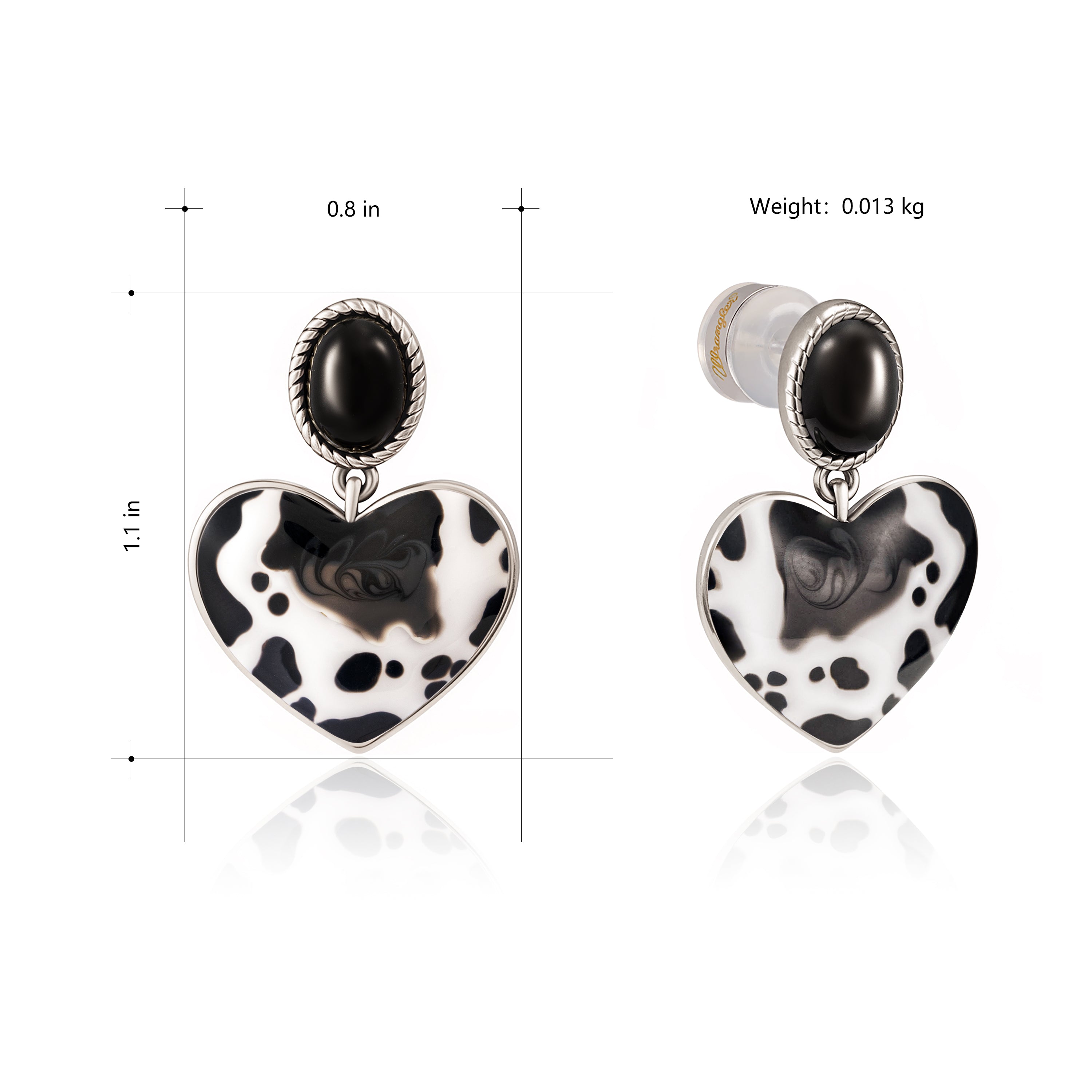 WGE-1129S Wrangler Silver Cow Print Heart Shape Dangling Earrings - Black