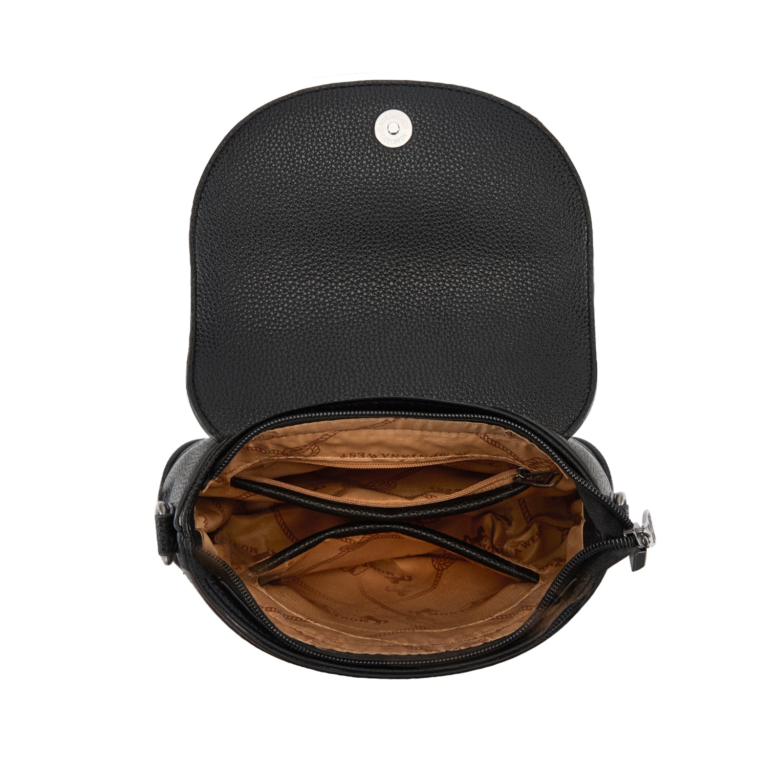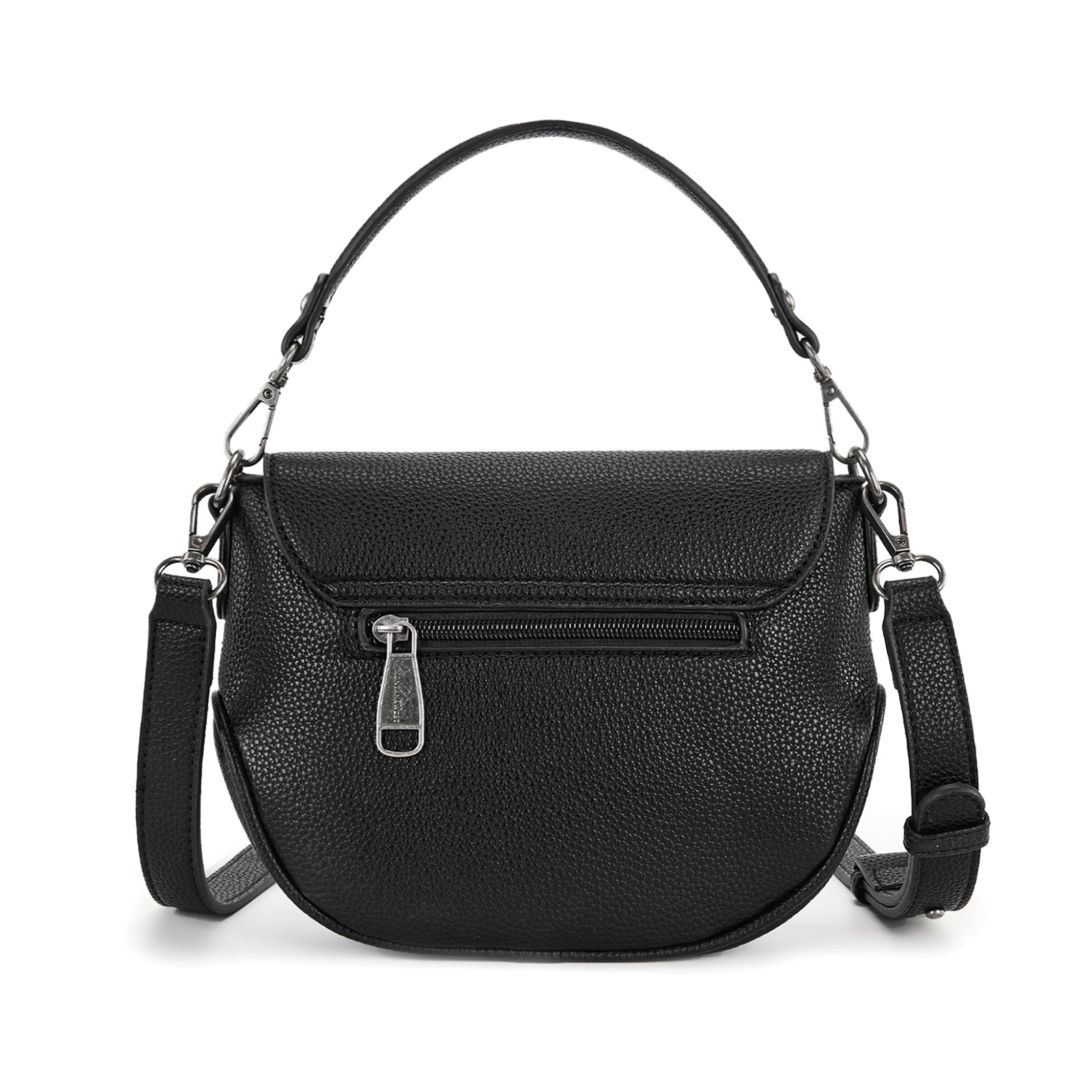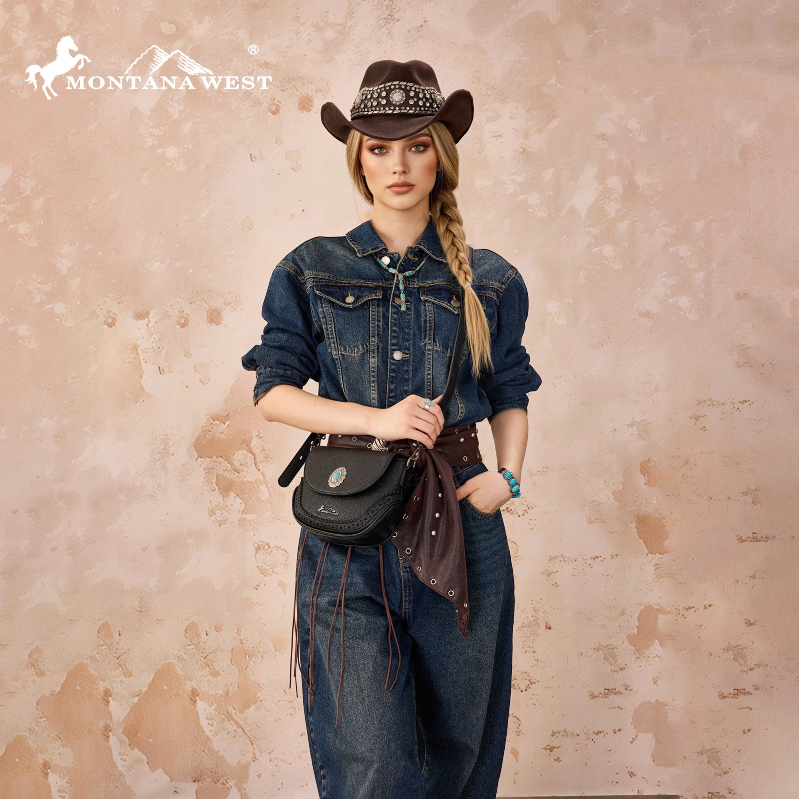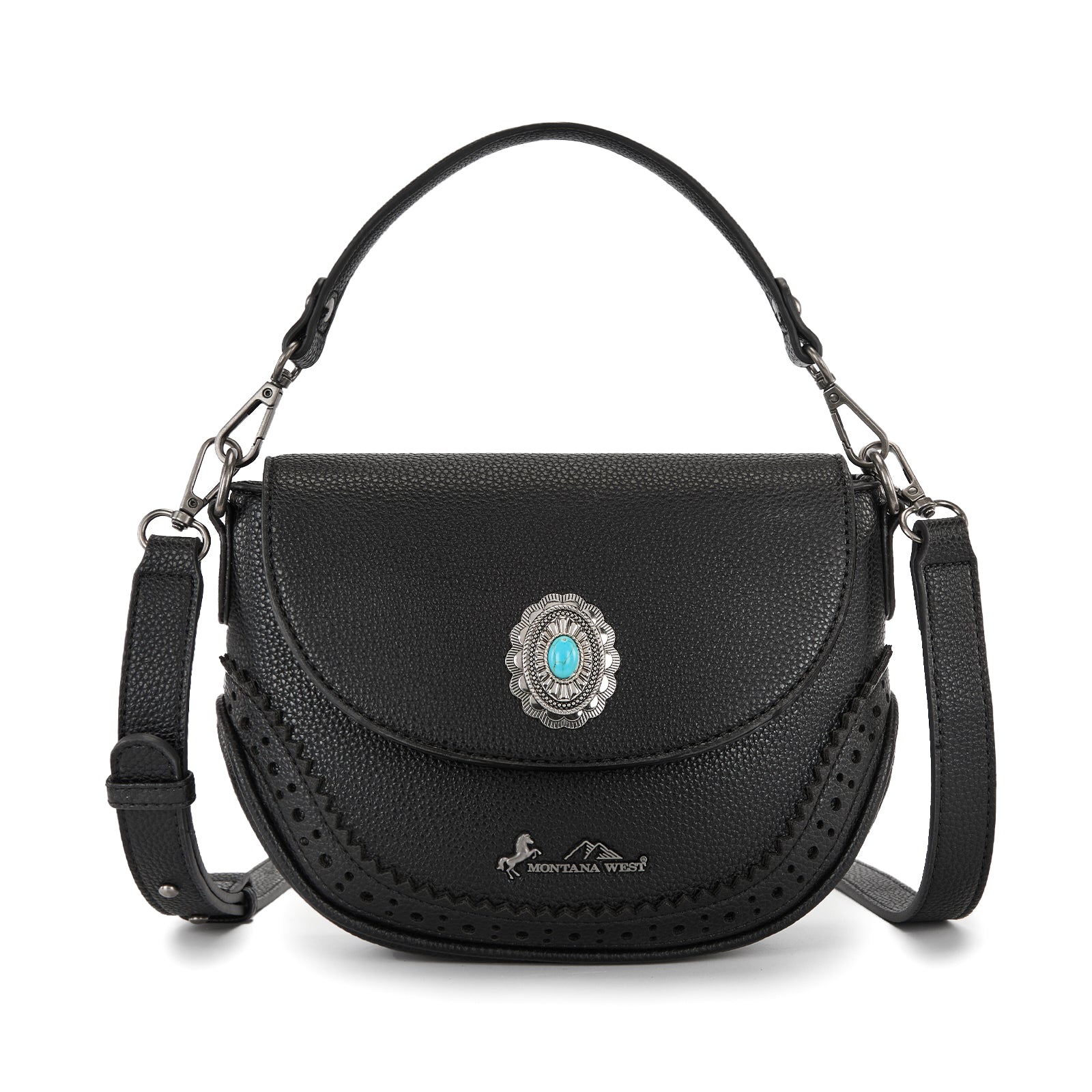 SKU:MW1340-8360BKThis Montana West saddle crossbody features a textured PU leather body accented with a stunning antique silver concho and turquoise stone centerpiece. Detailed stitching and cutout trim add authentic western character to this timeless design.
