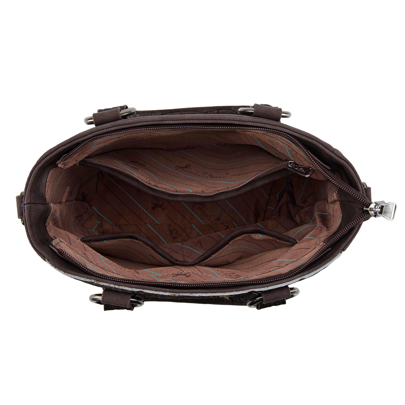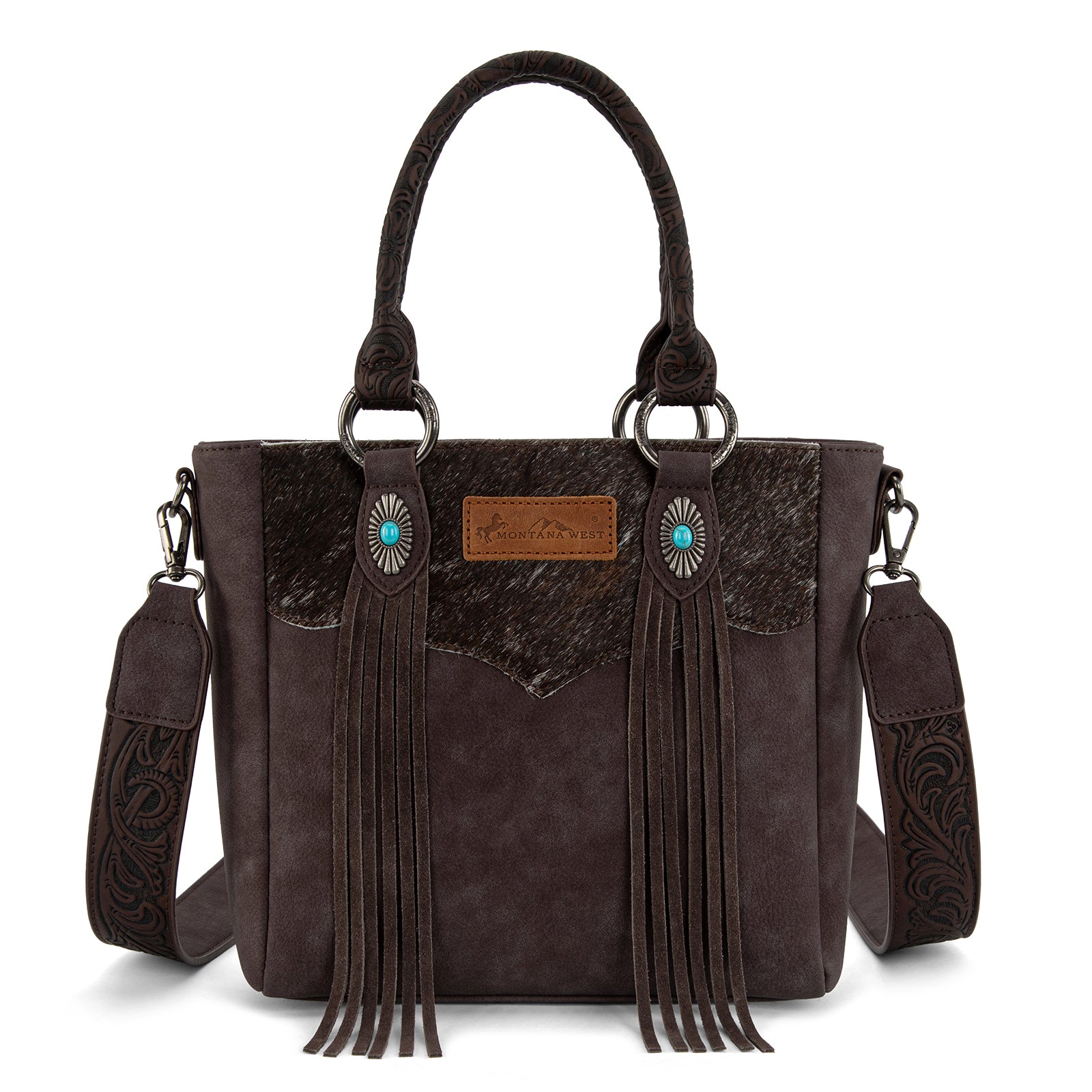 MW1358G-8120 Montana West Hair-On Hide Concealed Carry Tote Bag with Tooled Strap - Coffee