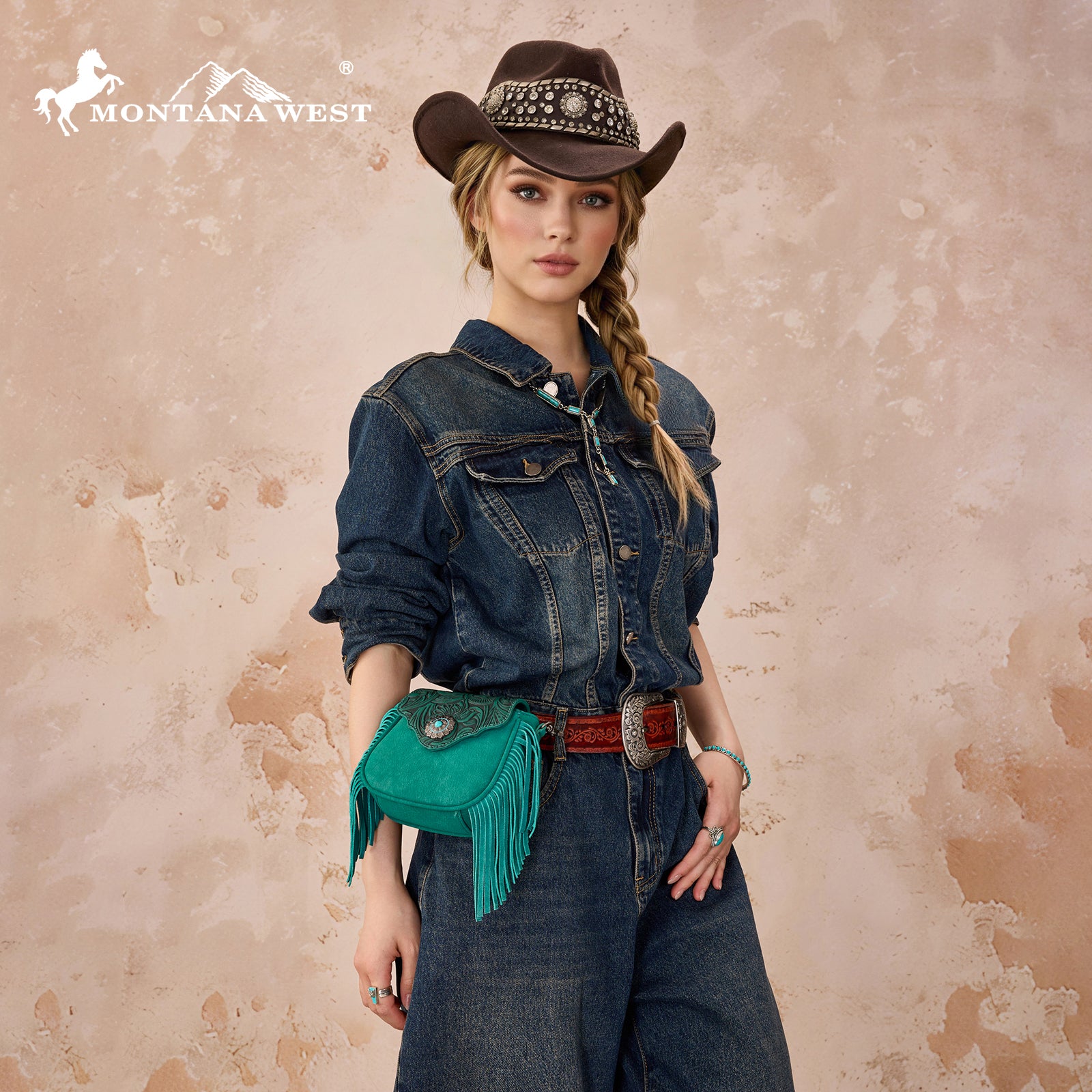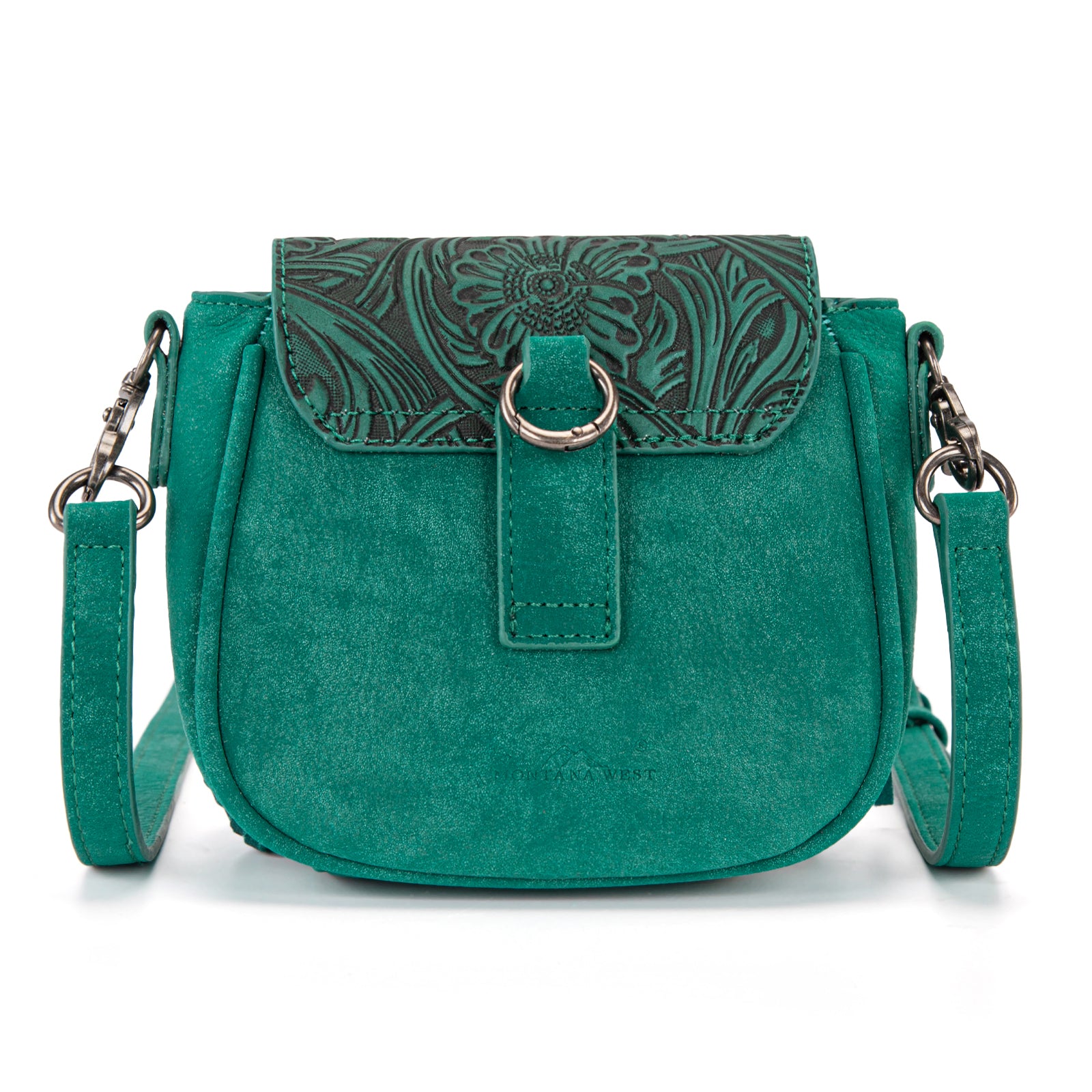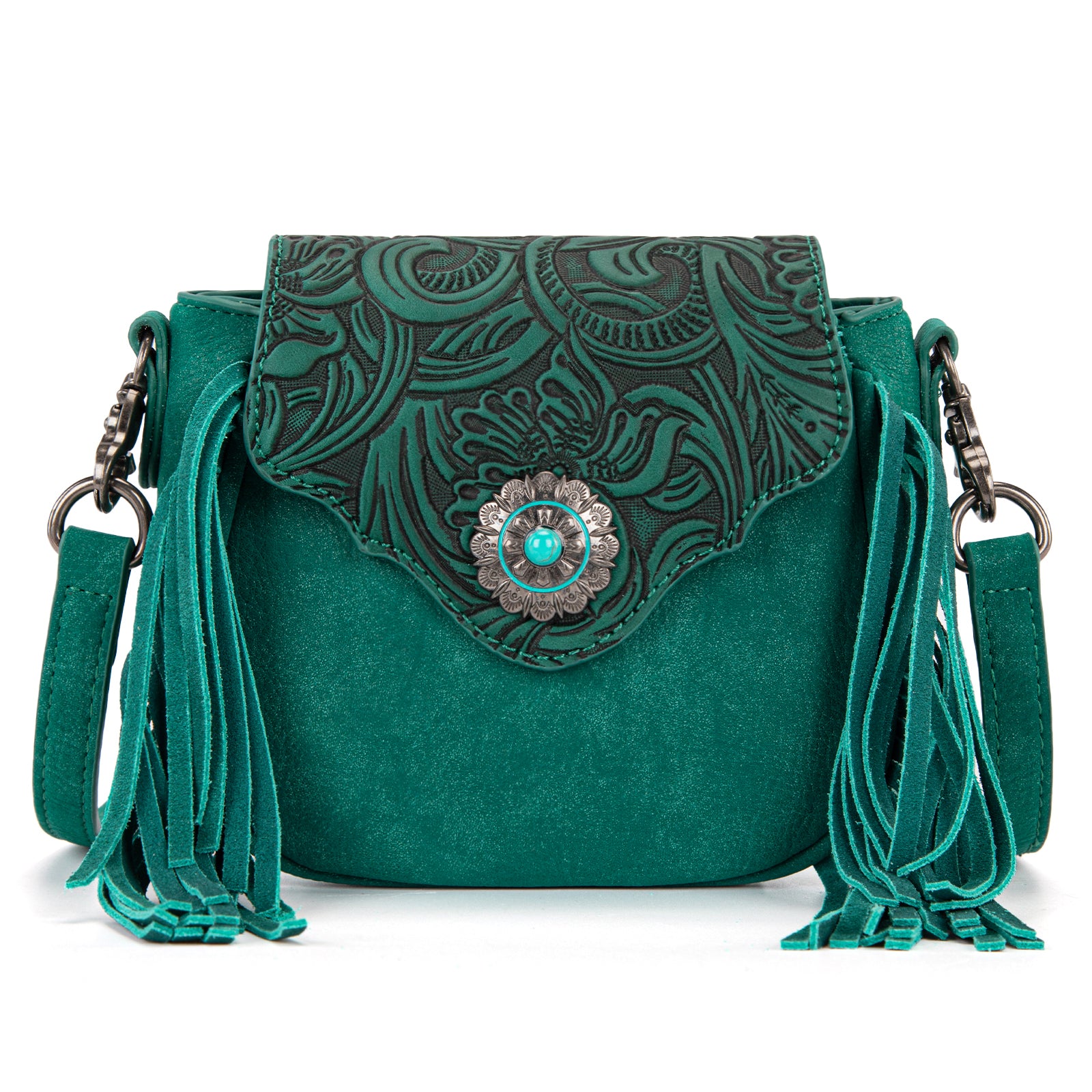 SKU:MW1366-8360TQAdd a touch of Western charm to your everyday style with this stunning Montana West mini crossbody bag. This compact bag features an intricately embossed floral flap and a striking concho accent with a turquoise stone centerpiece. Fringe detailing on both sides gives it that perfect boho-Western flair.
