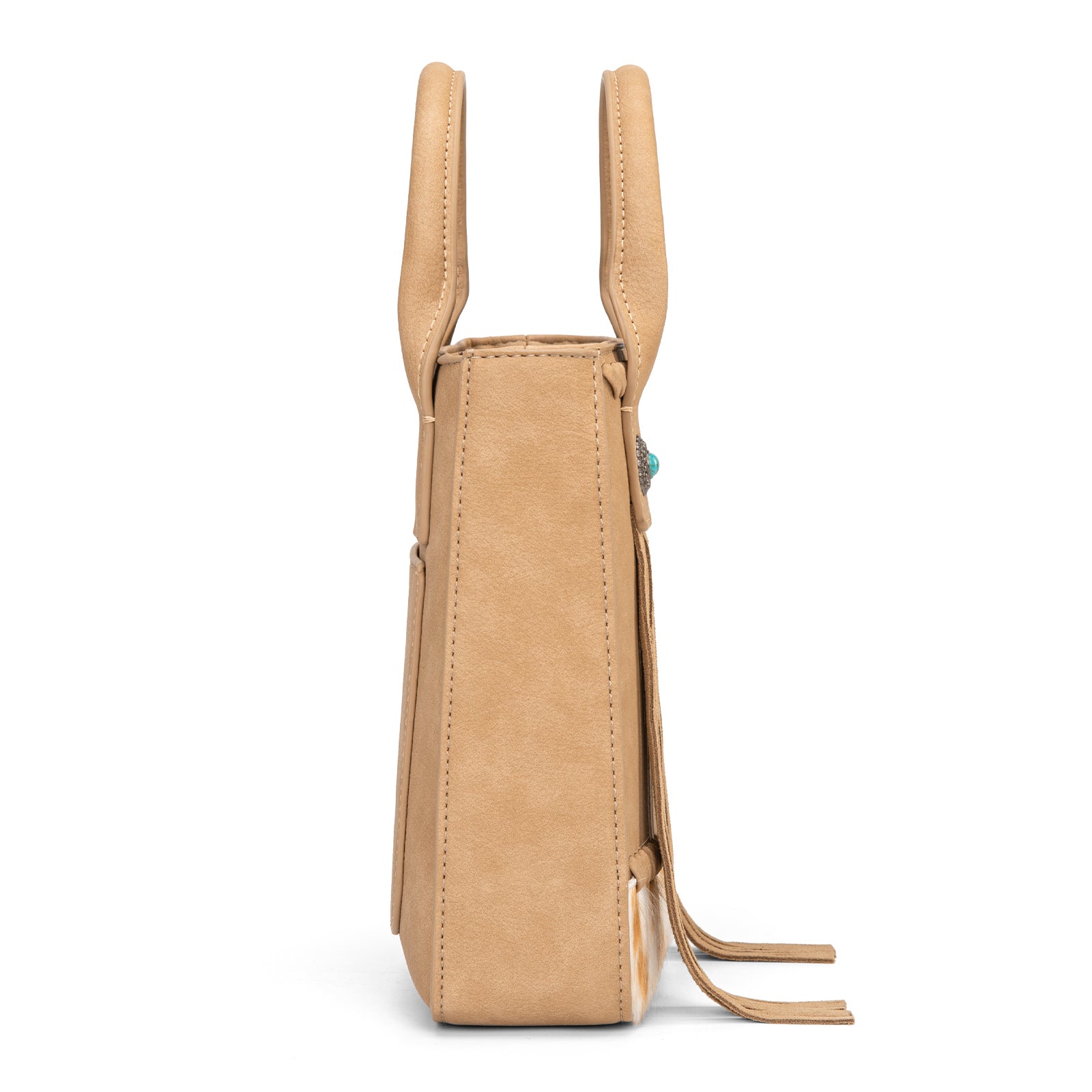 SKU:MW1368-8360TNBold western style with eye-catching details. This Montana West tote features genuine hair-on cowhide accents paired with sleek PU leather for the perfect mix of rustic and modern. Long fringe tassels and turquoise concho accents add authentic western flair to this structured mini tote.