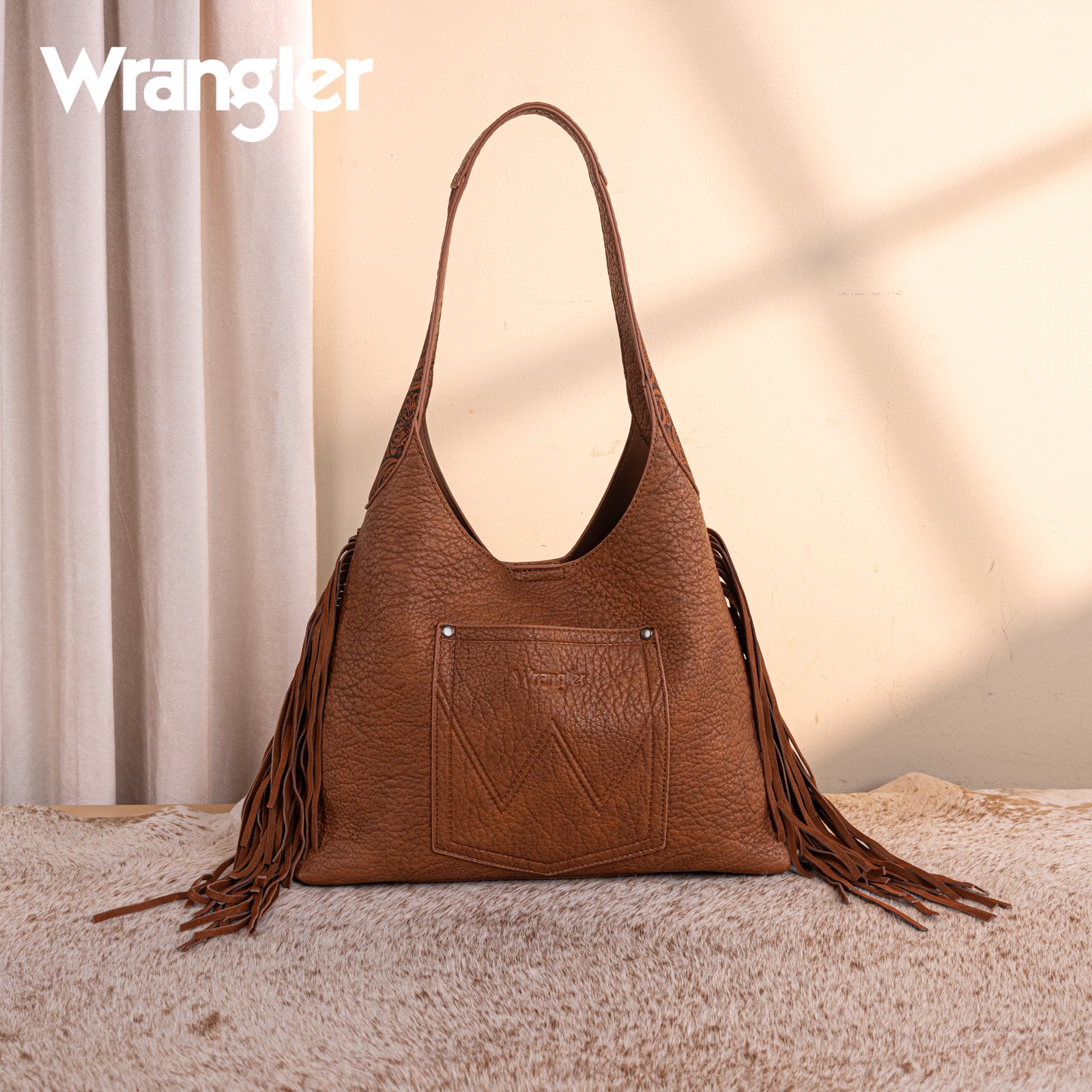 WG279-9182BR Wrangler Fringe Floral Tooled Hobo Bag-Brown