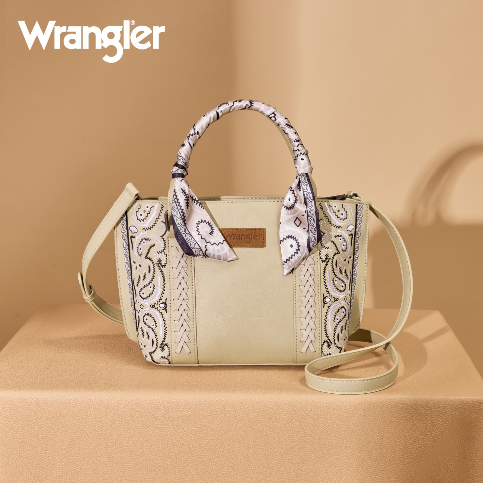 SKU:WG331-2005TNCrafted from durable PU leather, this bandana hand-tie handle tote combines western charm with everyday functionality. Featuring an embroidered paisley accented with whipstitch details, it’s finished with a Wrangler® logo applique on the front for a signature touch.