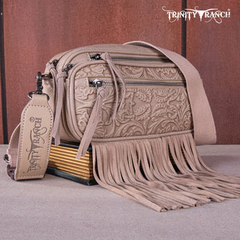 TR165-198 Trinity Ranch Floral Tooled Triple Zippered Pocket Fringe Belt Bag