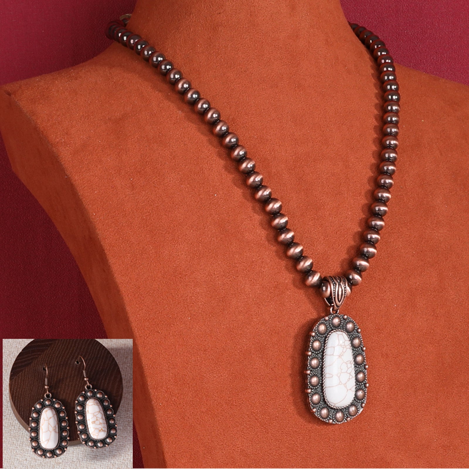 RNS-1019 Rustic Couture's Bohemian Beaded Necklace Oval Pendant Earring Set