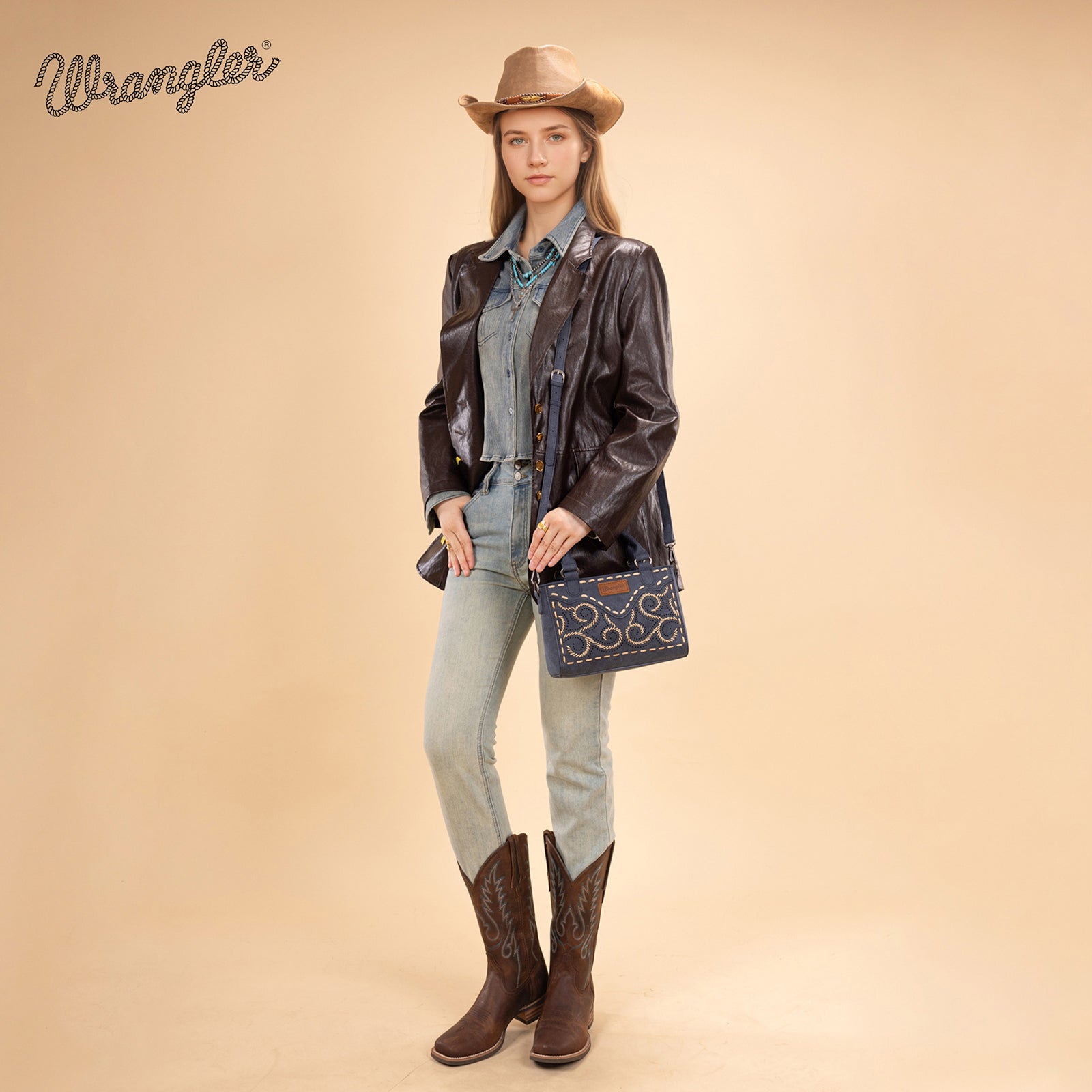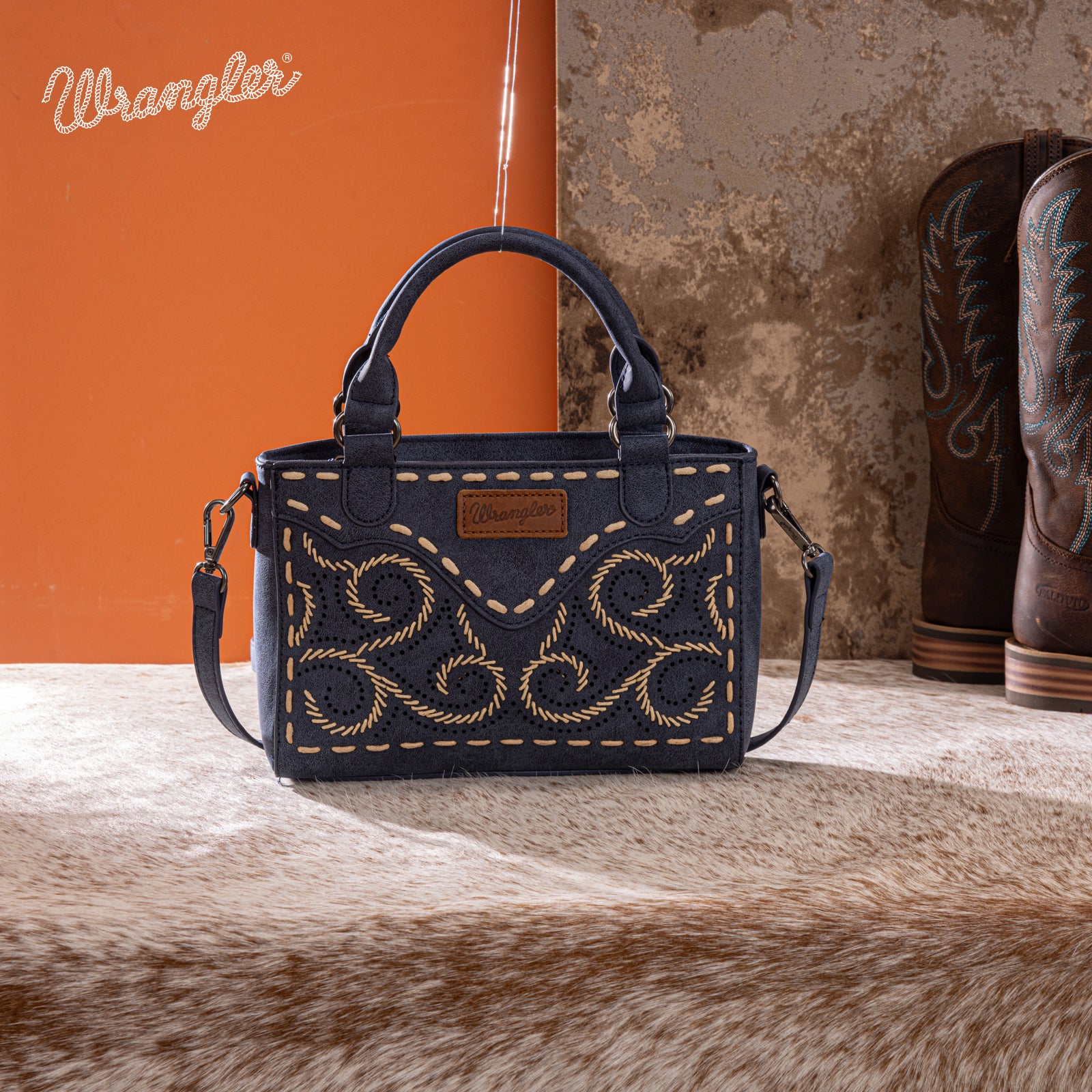 Add a touch of Western charm to your everyday look with this beautifully crafted Wrangler mini satchel. Designed with intricate embroidered swirl detailing and contrast whipstitch accents, this bag blends rustic character with modern functionality.