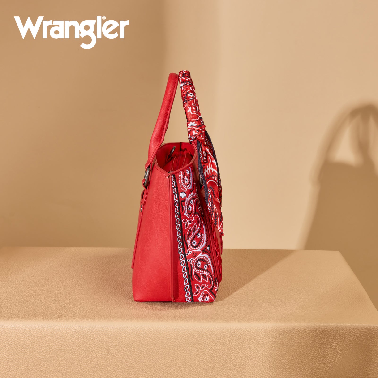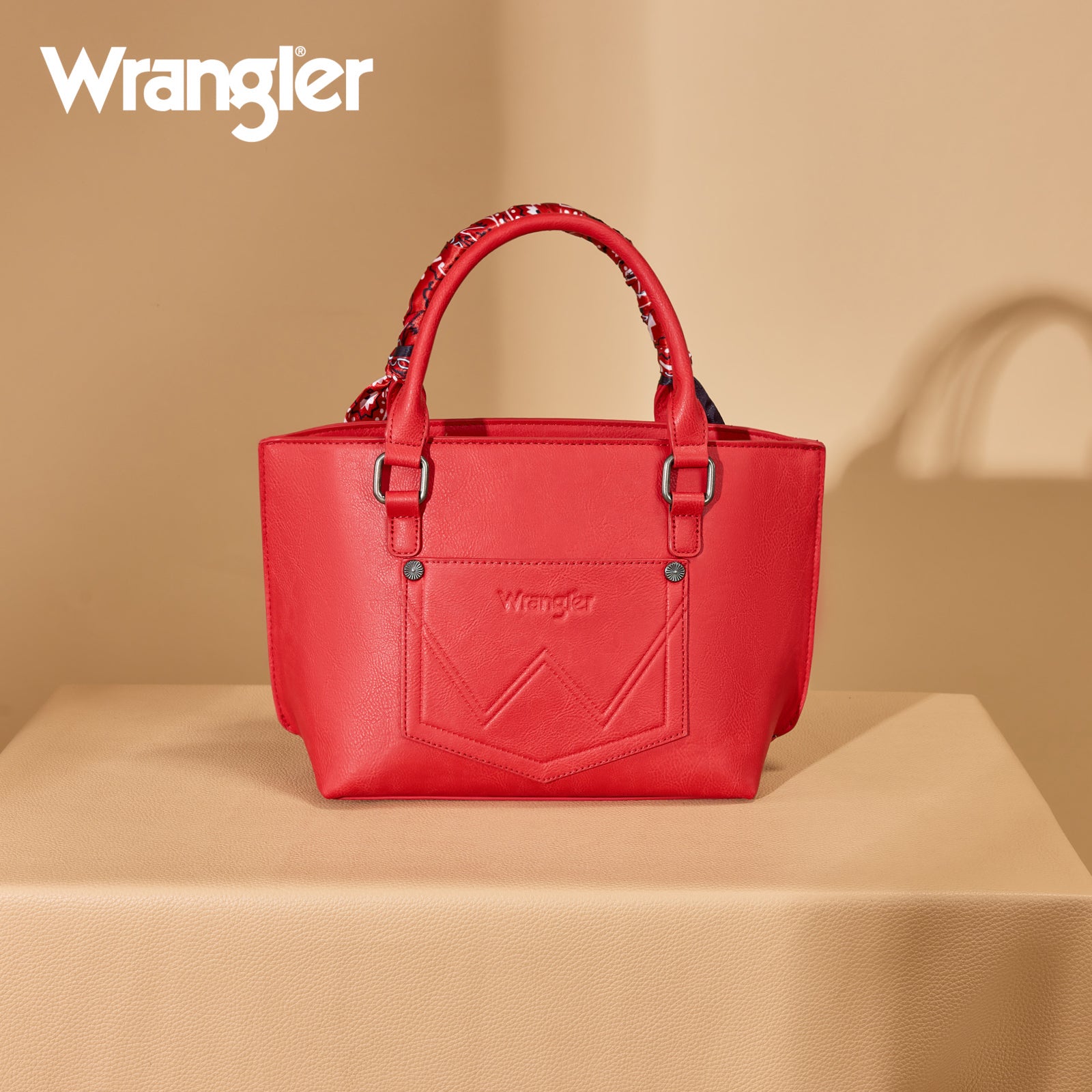 SKU:WG331-2005RDCrafted from durable PU leather, this bandana hand-tie handle tote combines western charm with everyday functionality. Featuring an embroidered paisley accented with whipstitch details, it’s finished with a Wrangler® logo applique on the front for a signature touch.