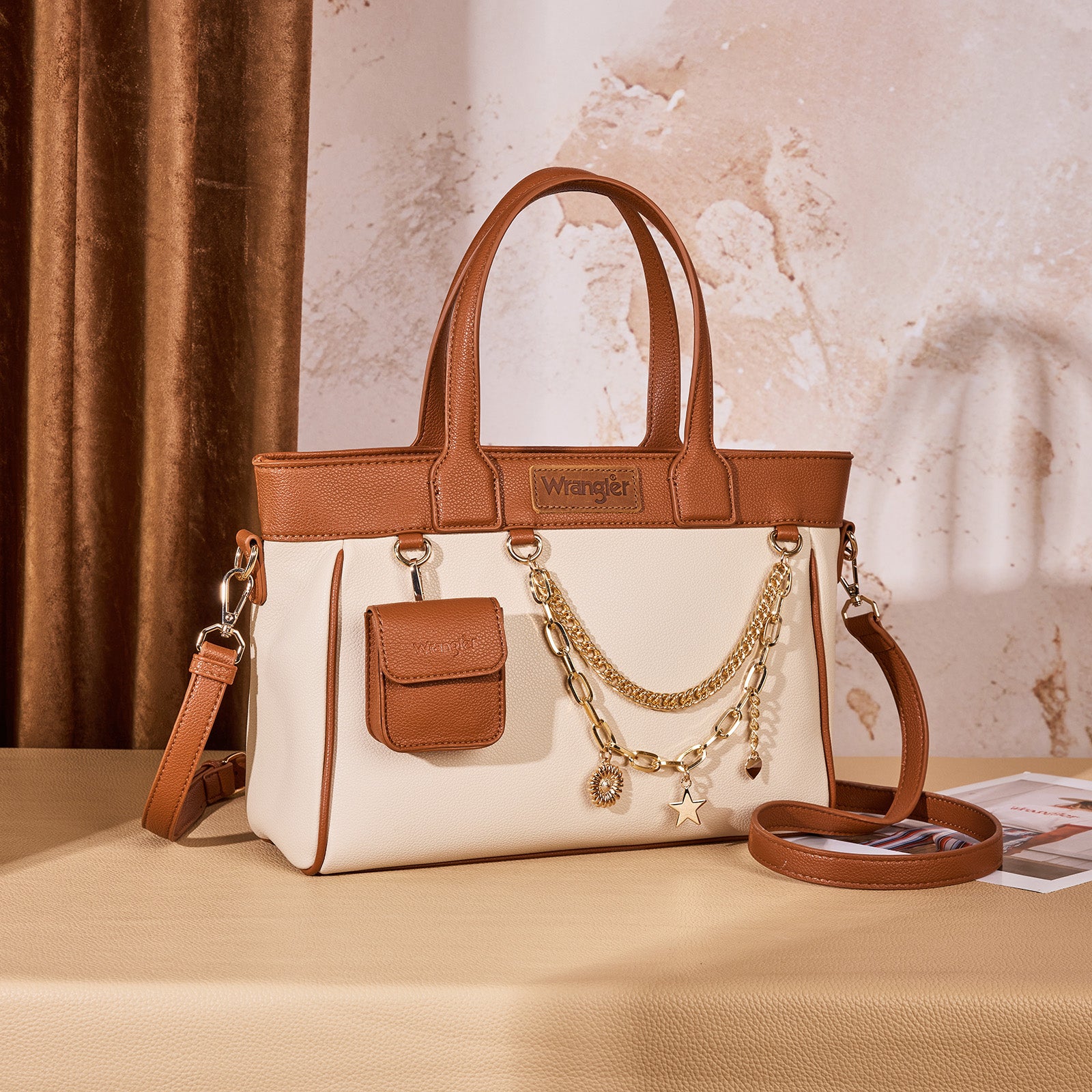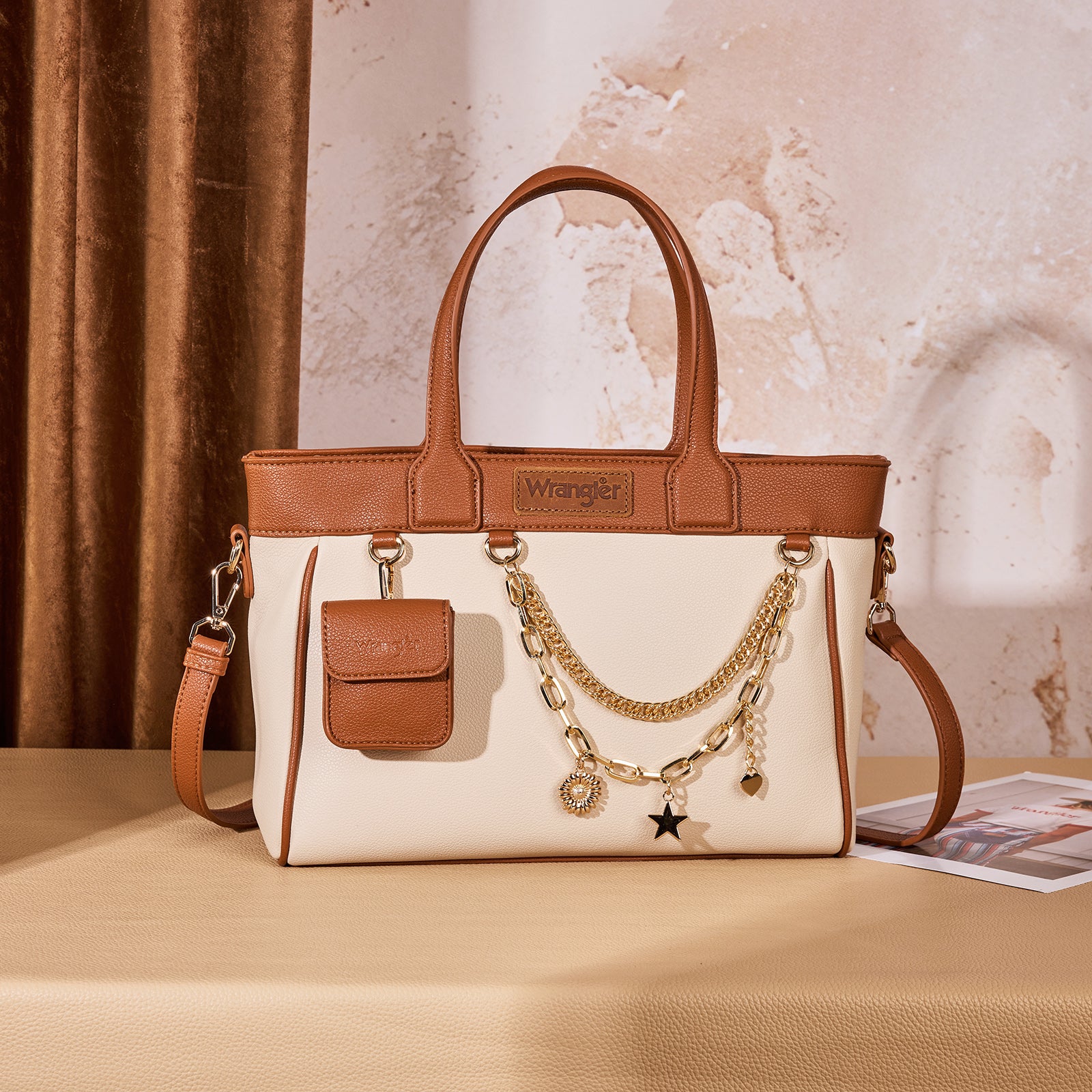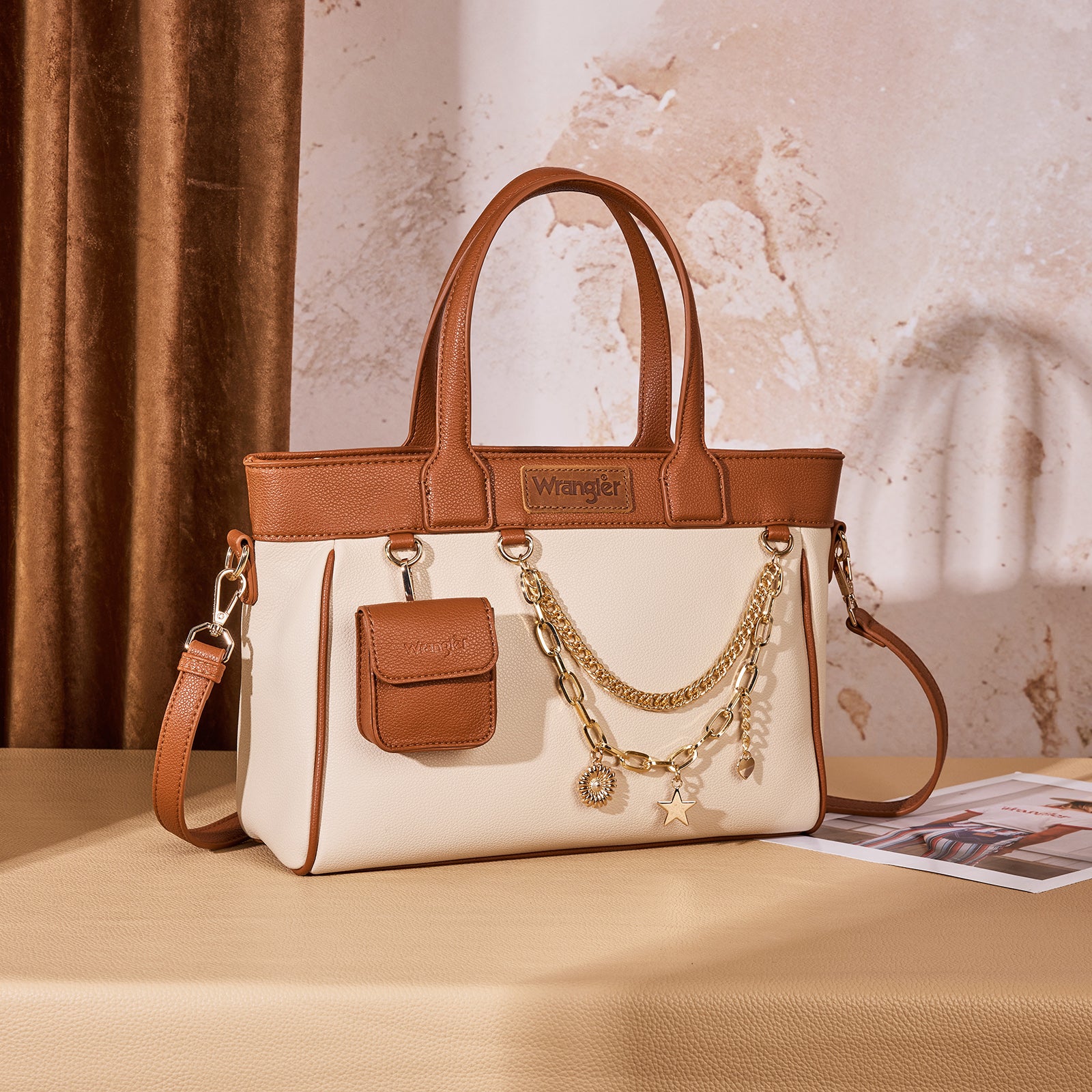 WG434-8300BR Wrangler Color Block Tote with Chain Charm & Mini Pouch - Brown