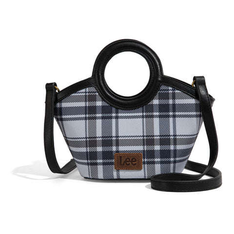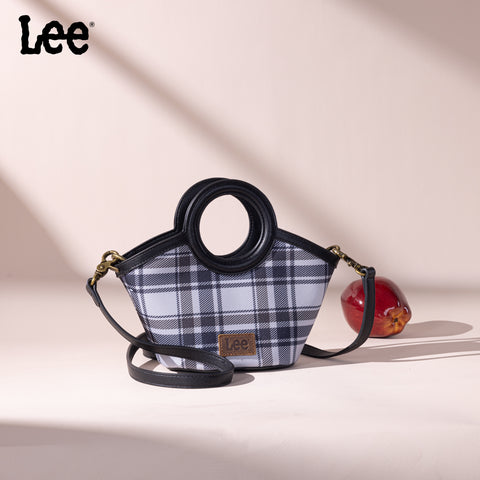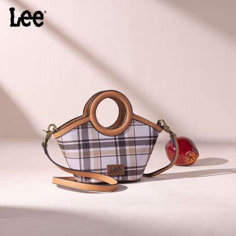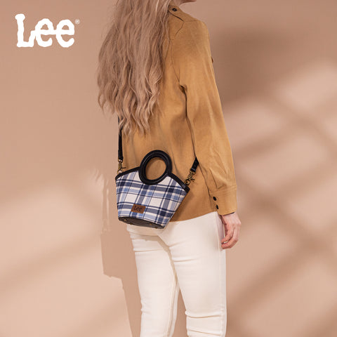 Made of canvas and PU leather trimmed, this bucket bag/crossbody bag has: Plaid design LEE logo applique Top round handle (Drop 3") Zipper closure Inside of the bag includes...