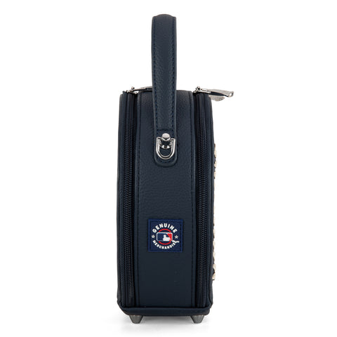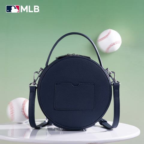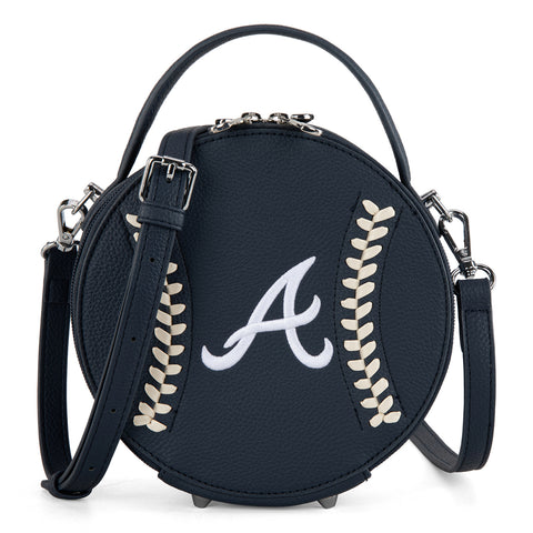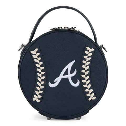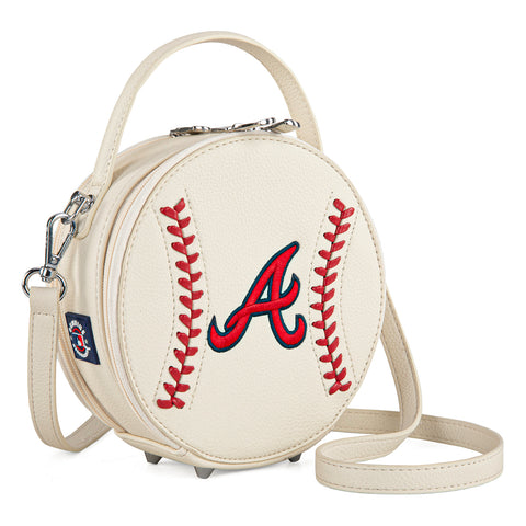 MLB OFFICIAL BASEBALL CIRCLE BAG/CROSSBODY Made of PU Leather, this circle bag/crossbody has: Embroidered Atlanta Braves logo Baseball stitch Dual zipper closure Top handle (Drop 3") Inside of...