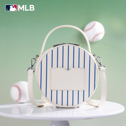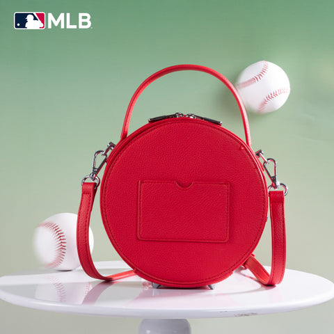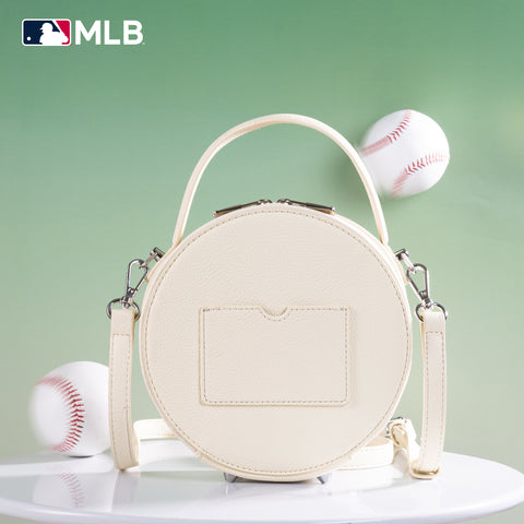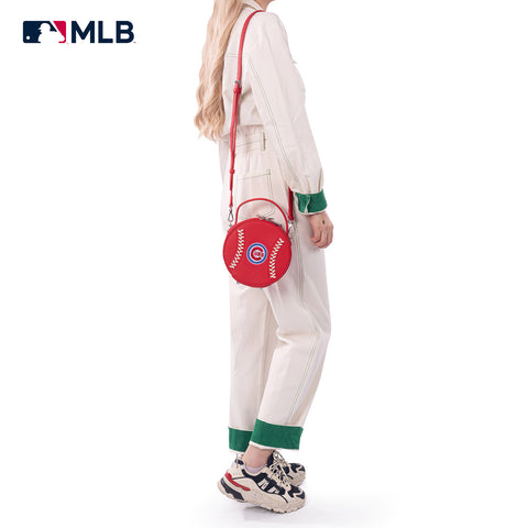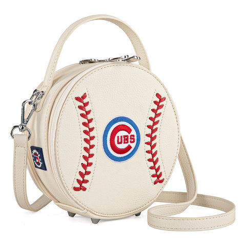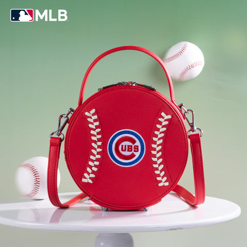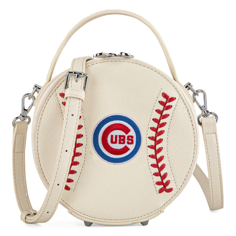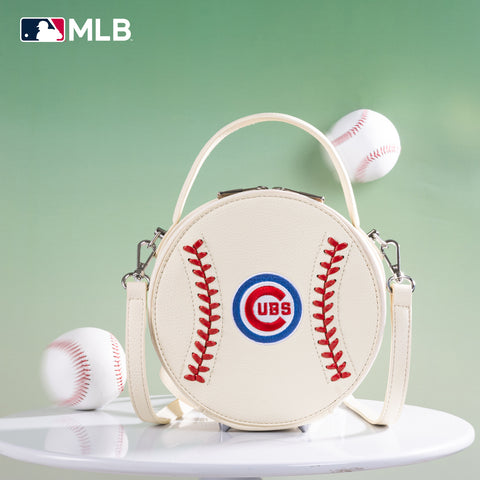 MLB OFFICIAL BASEBALL CIRCLE BAG/CROSSBODY Made of PU Leather, this circle bag/crossbody has: Embroidered Chicago Cubs logo Baseball stitch Dual zipper closure Top handle (Drop 3")...