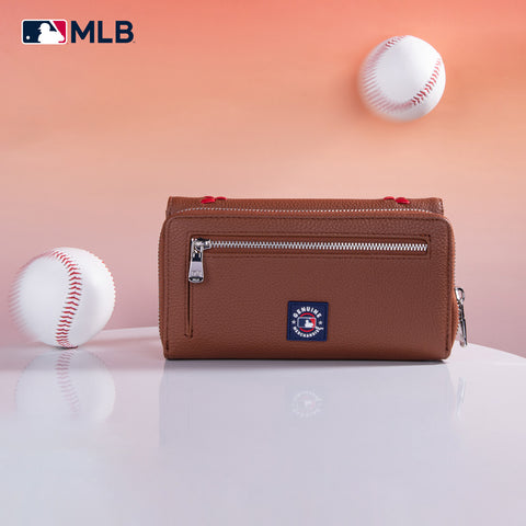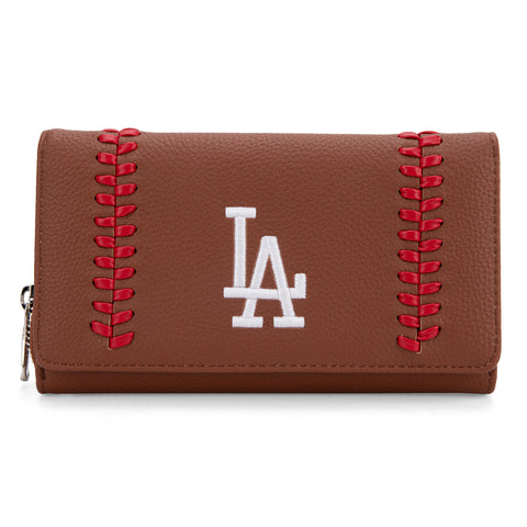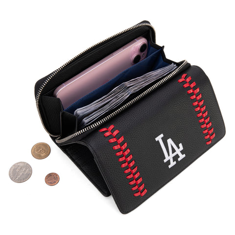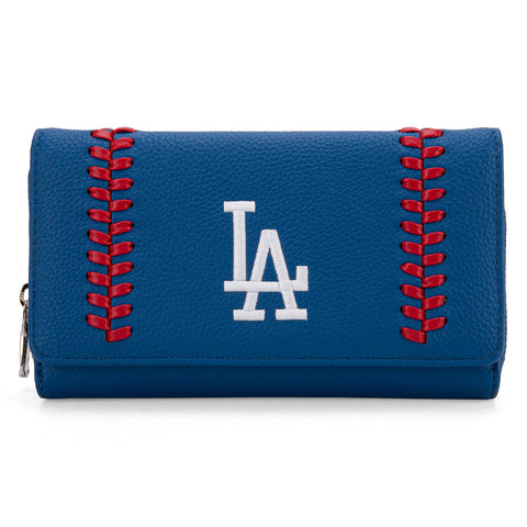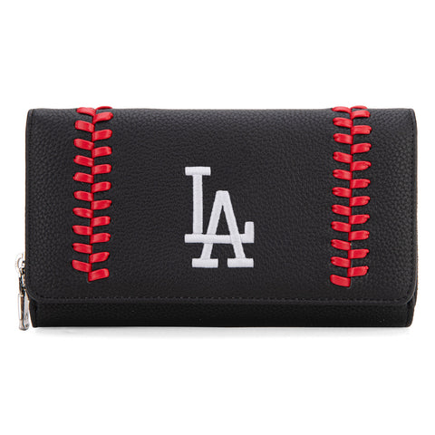 MLB OFFICIAL BASEBALL WALLET/WRISTLET Made of PU Leather, this tri-fold wallet/wristlet has: Embroidered Los Angeles Dodgers logo Baseball stitch Button closure on the front Features 11 card...