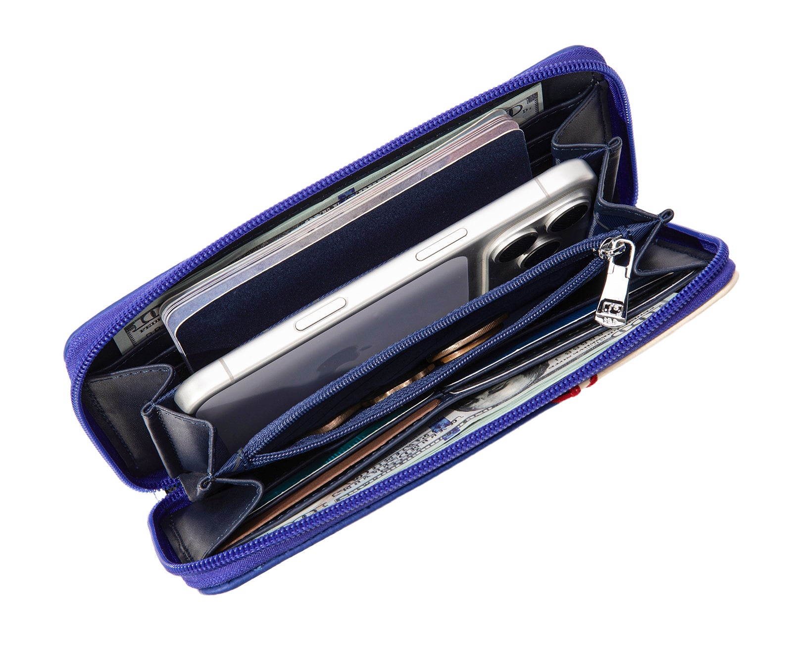 - Zip-around closure with 12 card slots, bill compartments, and a secure zip pocket