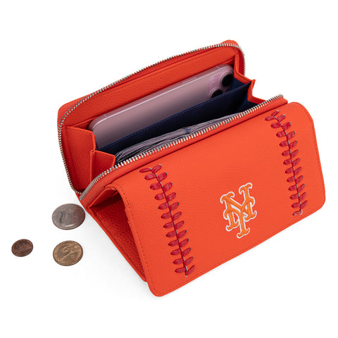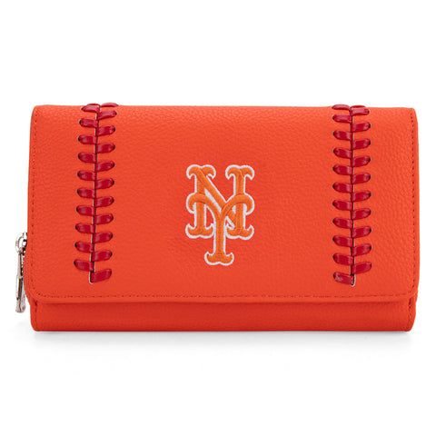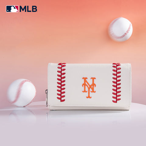 MLB OFFICIAL BASEBALL WALLET/WRISTLET Made of PU Leather, this tri-fold wallet/wristlet has: Embroidered New York Mets logo Baseball stitch Button closure on the front Features 11 card slot,...