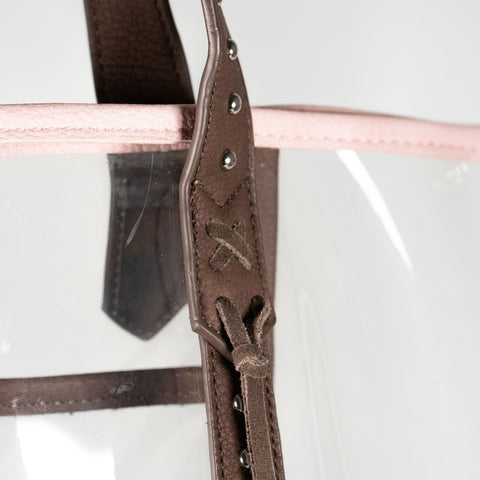 This western clear tote bag with PU leather trimmed has: Hand-tied fringe Antique silver studs Top zipper closure Inside of clear bag included an open pocket Detachable embossed Aztec...