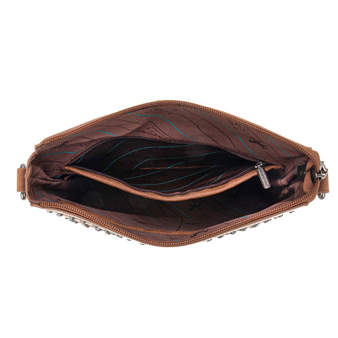 Made of PU leather (suede-feel), this crossbody bag has: Antique silver floral buckle on the flap with magnetic closure Floral tooled Antique silver embellishments Top zipper closure Inside zippered compartments...