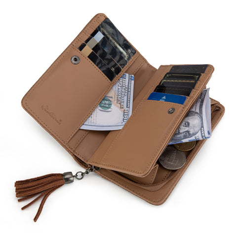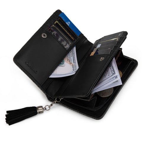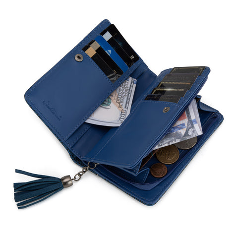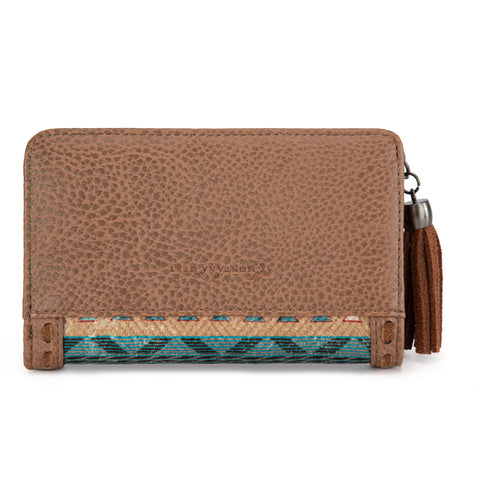 Made of PU leather and denim, this wallet has: Aztec pattern Saddle stitch Button closure 8 credit card slots, 2 slide pockets and a zippered compartment Tassel zipper pull 6" x...