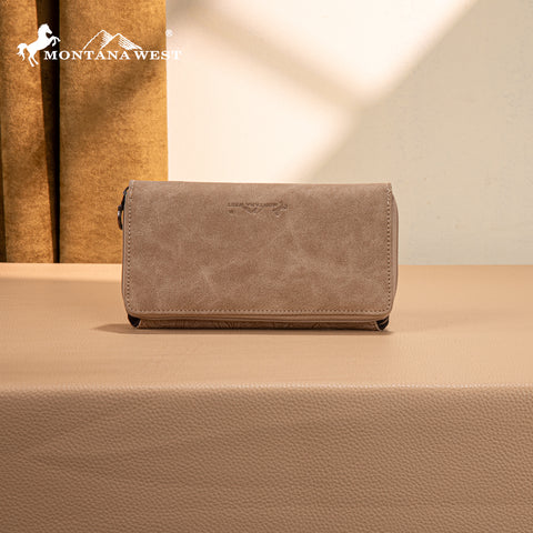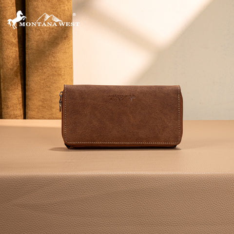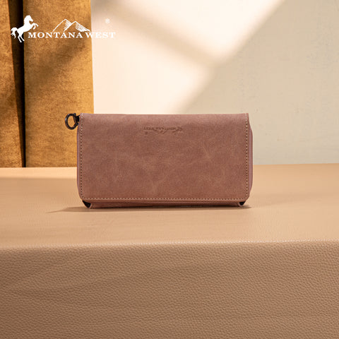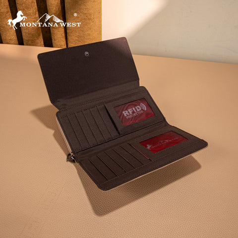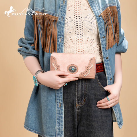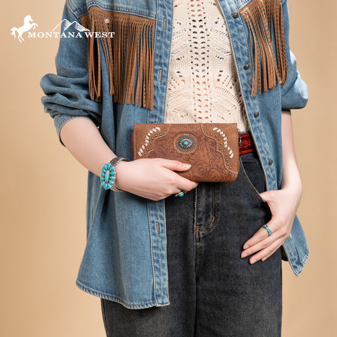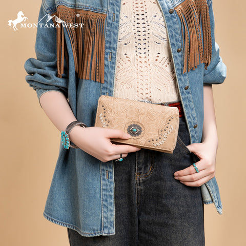 Made of PU leather, this wallet has: Embossed floral pattern Antique silver Navajo concho Whipstitch detail Button closure Multiple card slots and 2 long slot compartments Zipper closure on the...