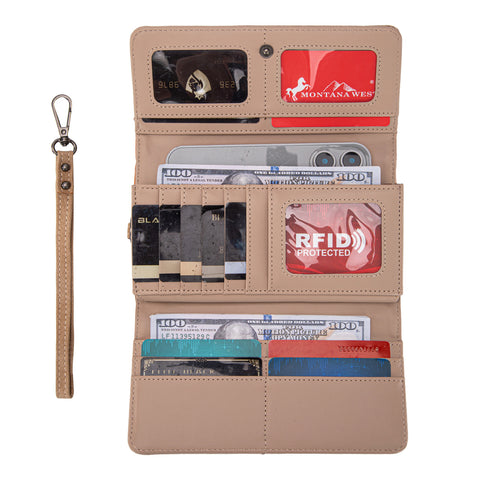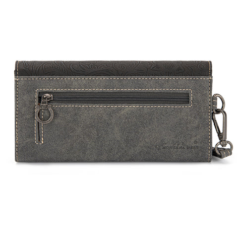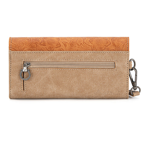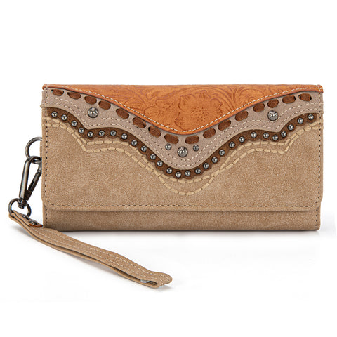 Made of PU leather, this western wallet has: Embossed floral pattern Scallop trimmed with antique silver studs Saddle stitch detail Single removable strap to convert the wallet into a wristlet...