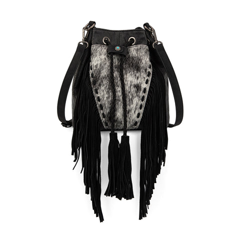 MW1349-8311 Montana West Hair-On Cowhide Drawstring Crossbody Bucket Bag - Black