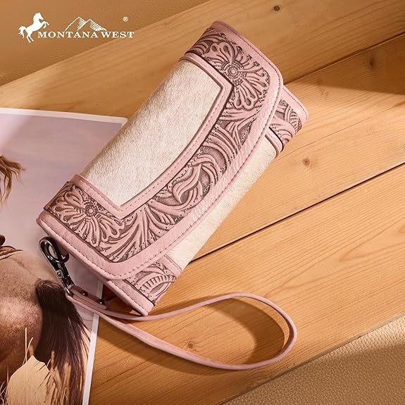MW1360-W018 Montana West Hair-On Hide Tooled Wallet – Western Wristlet - Pink