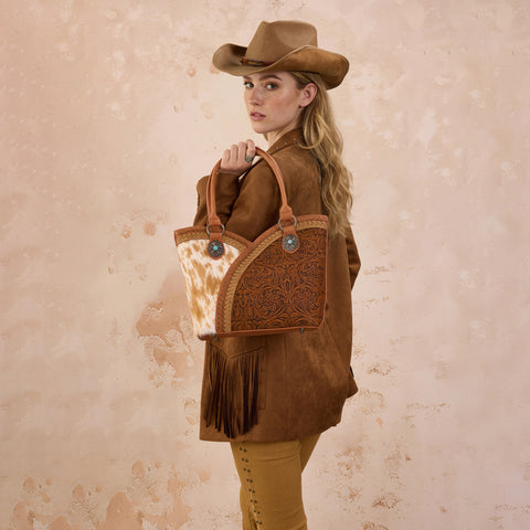 Make a bold Western statement with this beautifully detailed tote. Featuring a striking combination of genuine hair-on cowhide and intricately embossed floral tooling, this bag blends rustic charm with feminine...
